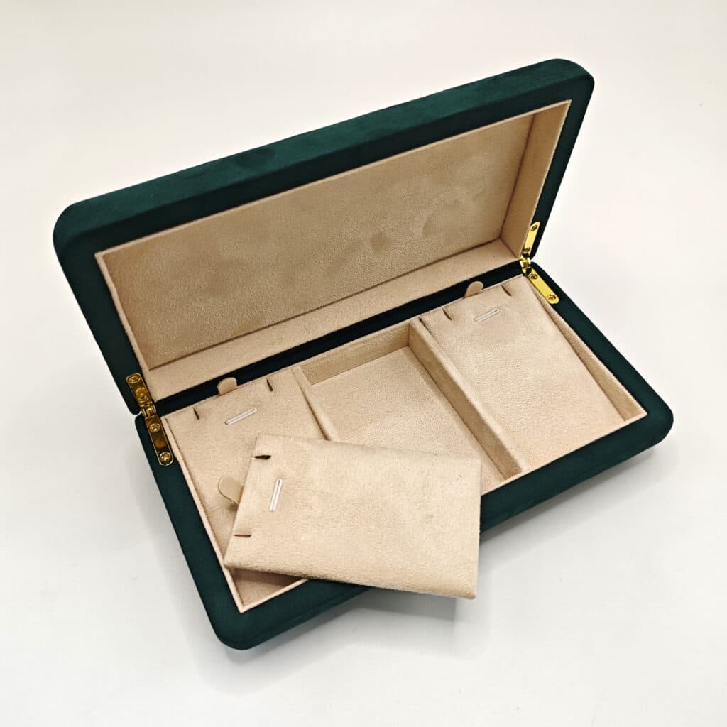 Standard velvet is not appropriate for high-end jewelry displays. High-quality microfibre is here. It has a shorter pile than velvet, so it doesn’t show “finger marks” as easily, and it has a matte surface that absorbs light, letting diamonds glitter more in comparison.