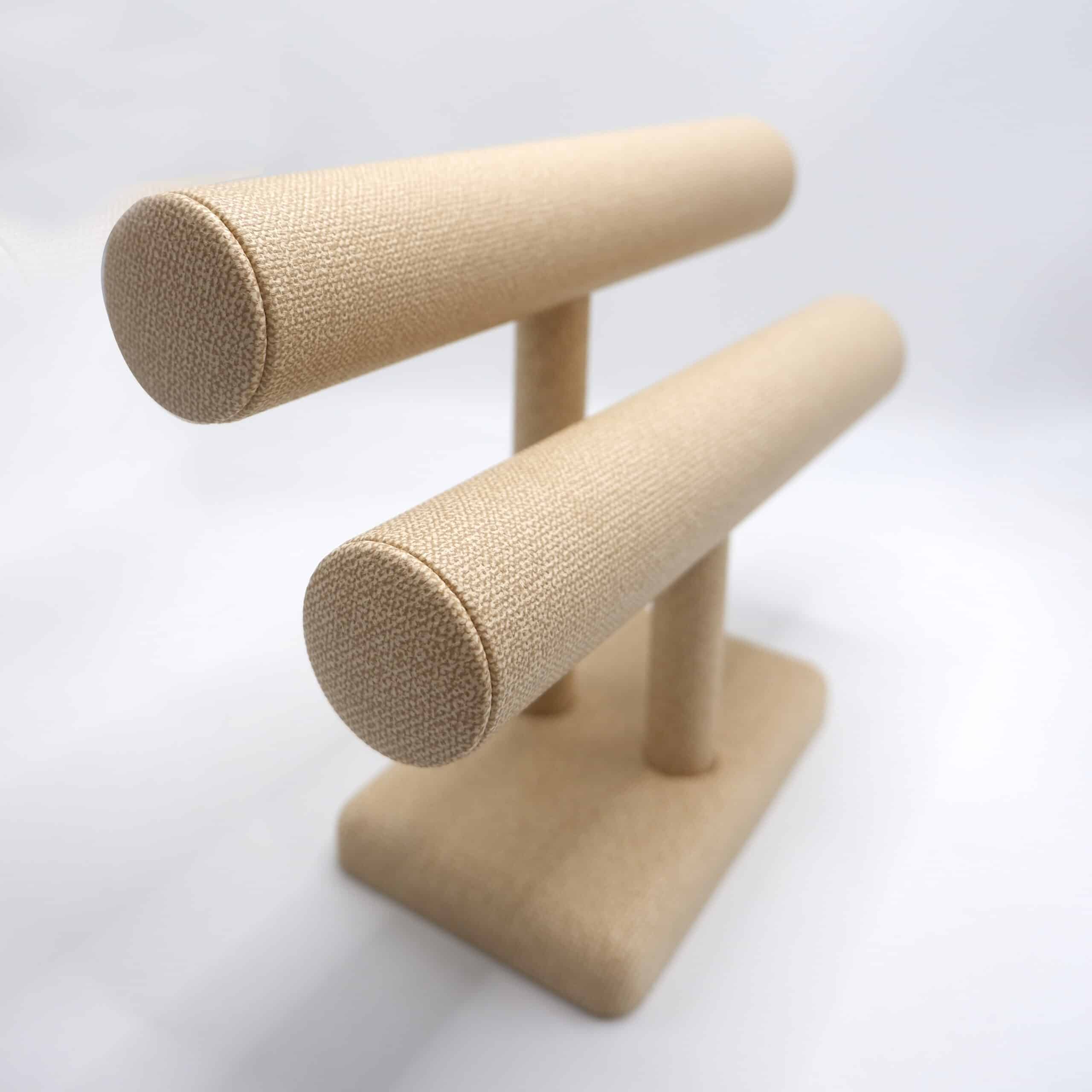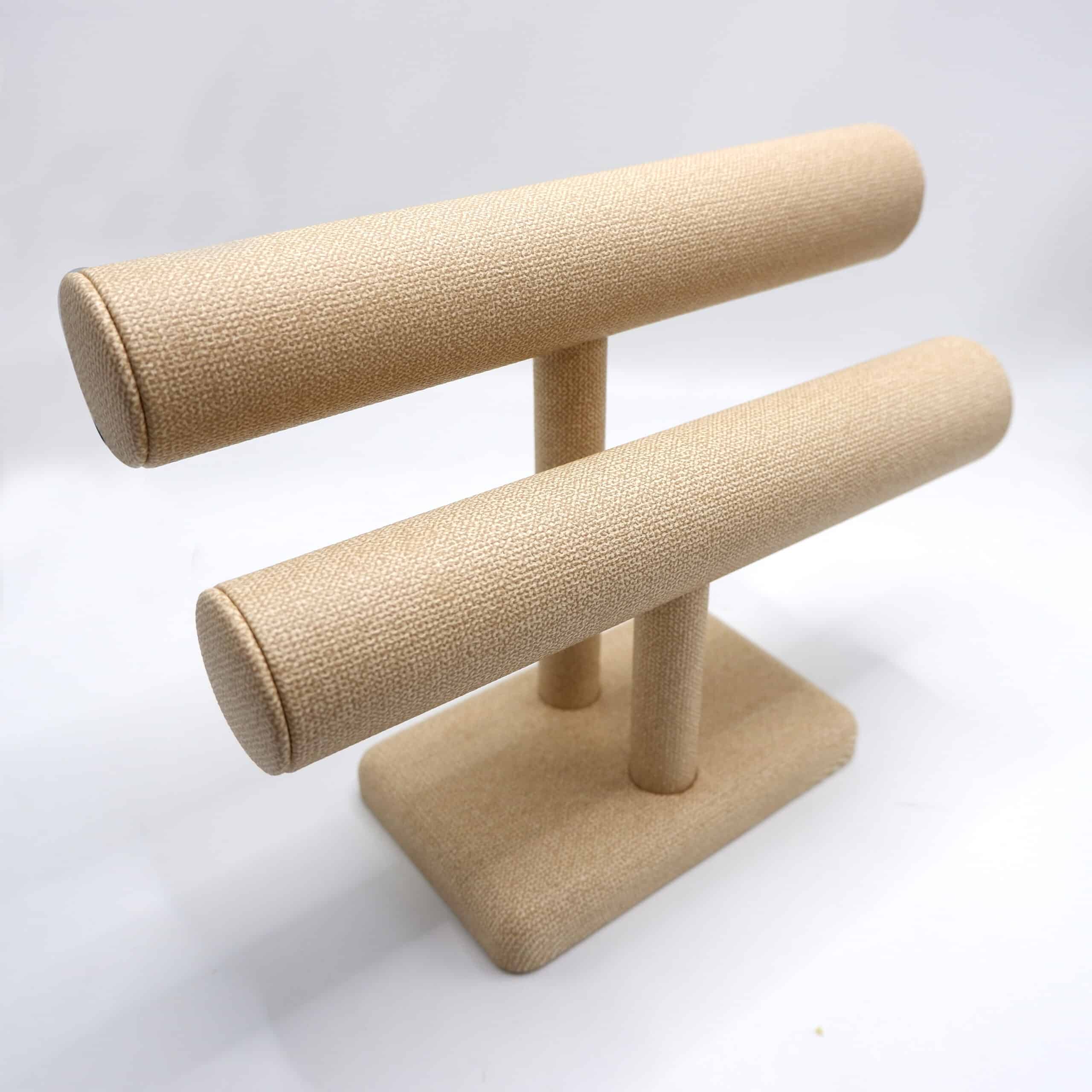 Jewelry Display Solutions for Retail Elevate Your Jewelry Displays with Our Linen 2-Band T-Bar Stand Discover the perfect blend of style, functionality, and elegance with our Beige Linen 2-Band T-Bar Bangle Holder, ideal for showcasing bangles, bracelets, and luxury watches. Designed for retailers and jewelry enthusiasts alike, this display combines premium aesthetics with practical features to create an inviting showcase for precious jewelry.