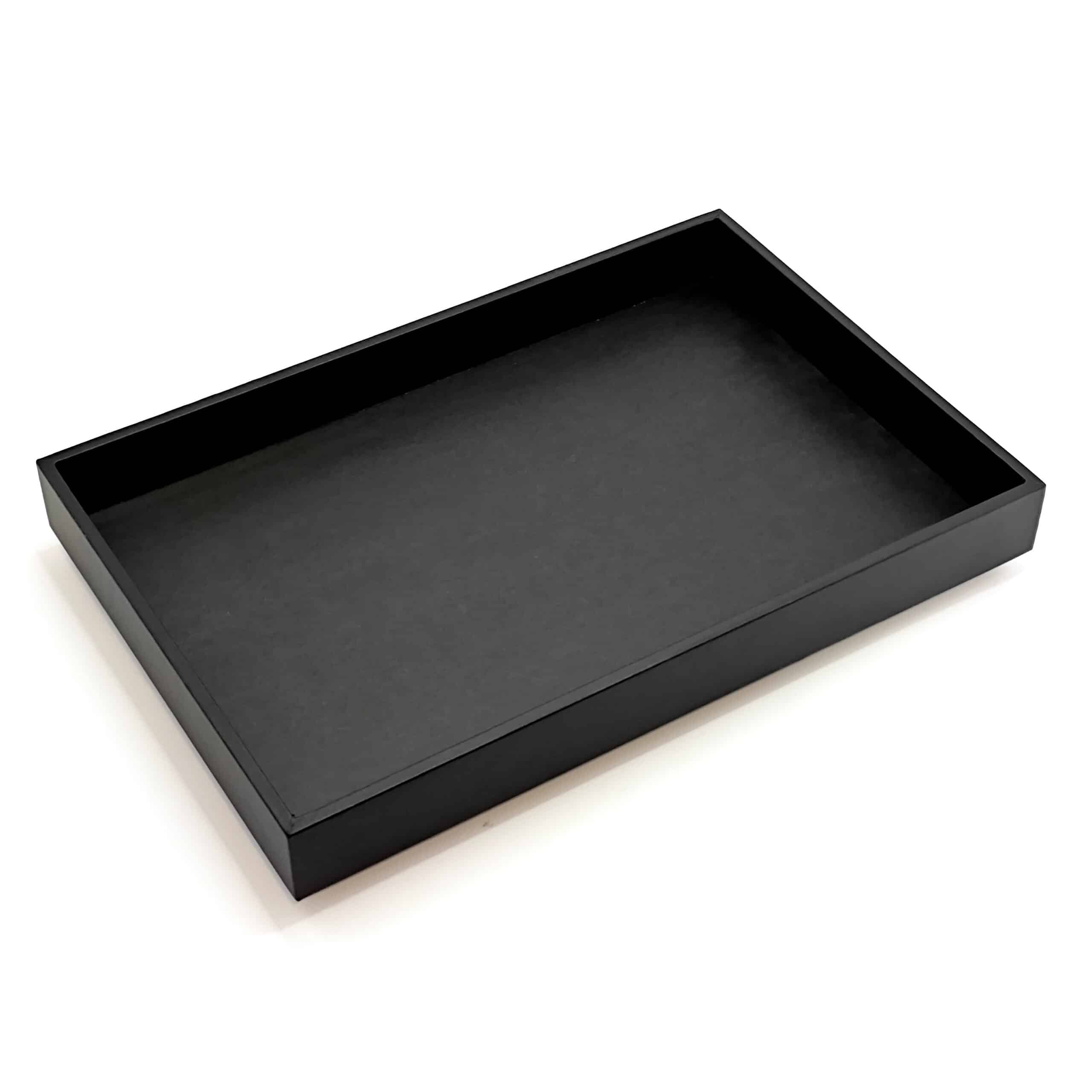 Black velvet jewelry display tray with a smooth PU leather exterior.