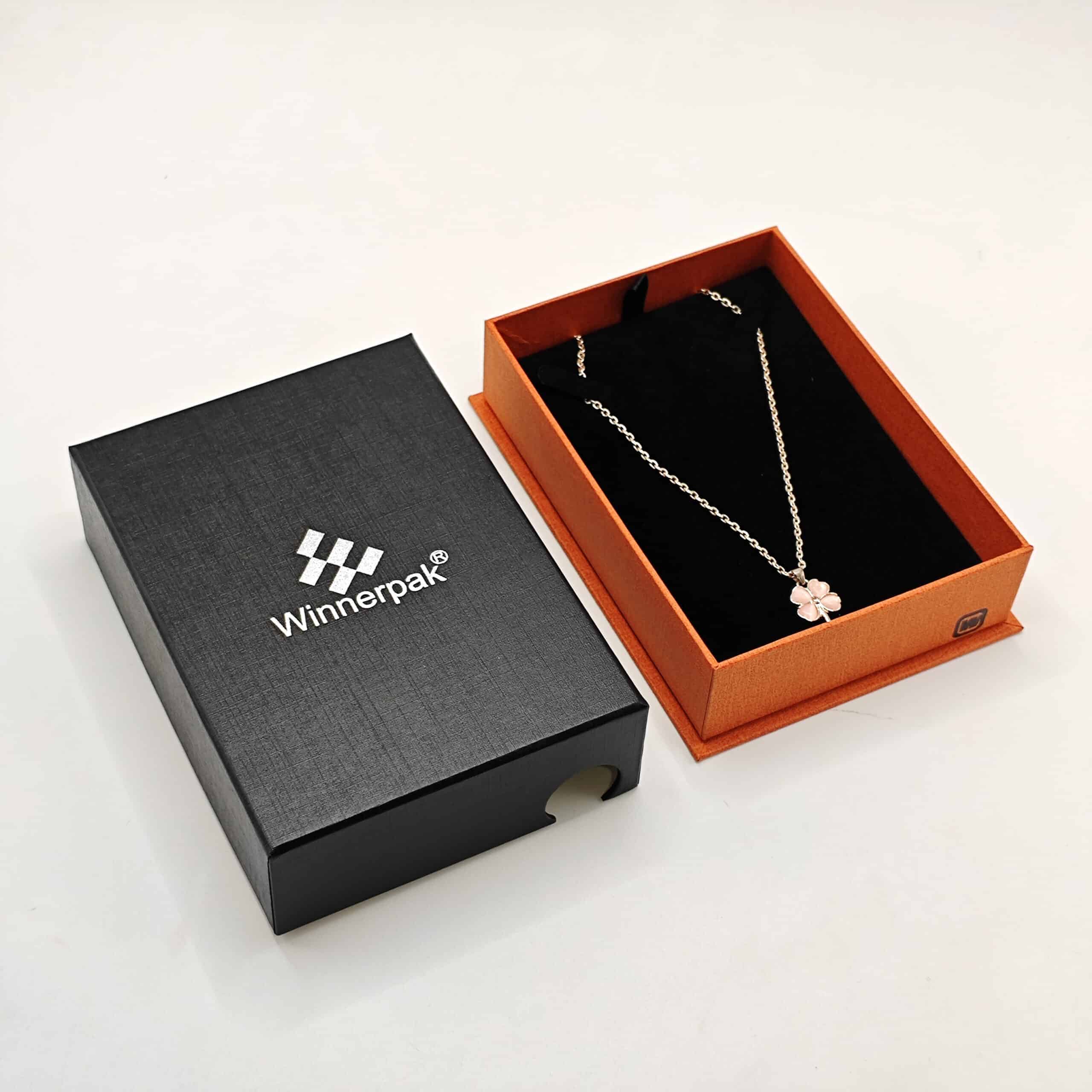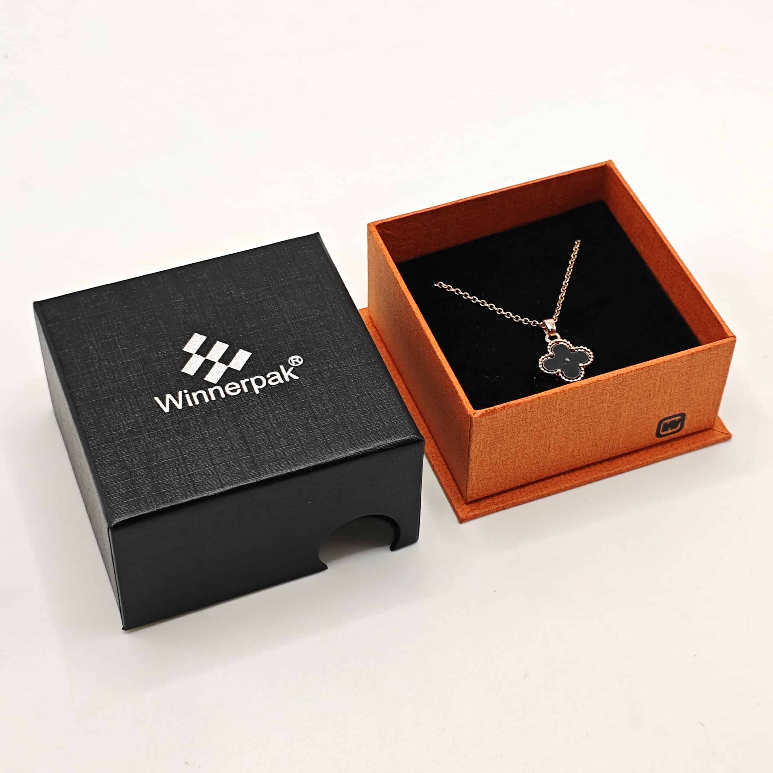 Handmade using 800 GSM FSC-certified cardboard, the box lid is wrapped in a luxurious black fancy art paper. In contrast, the box base and bottom cardboard are beautifully wrapped in deep orange fancy paper, offering a bold and vibrant contrast. WinnerPak ensures all materials are environmentally responsible, meeting your sustainable packaging needs.
