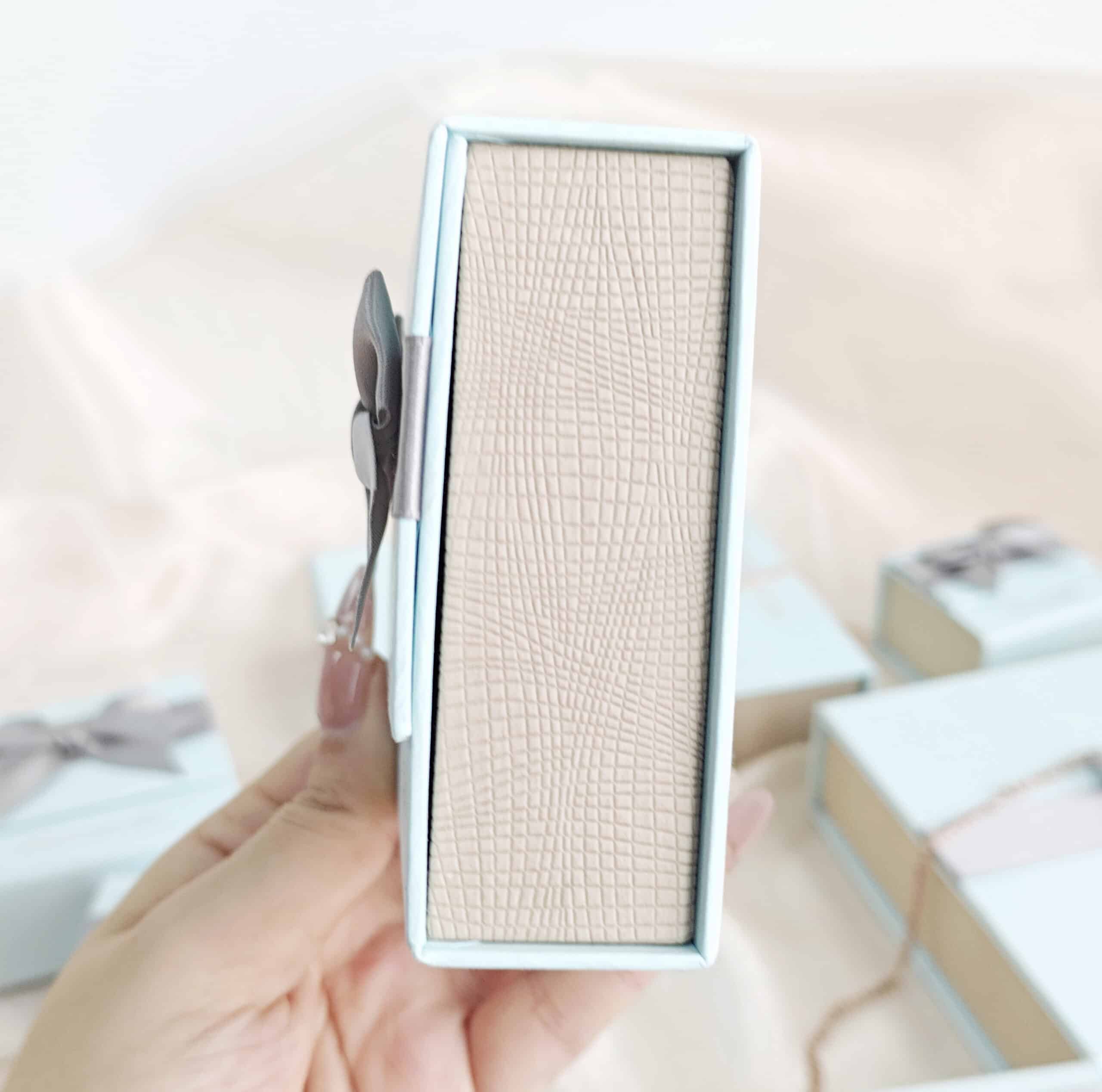 The combination of magnetic closing, ribbon bow, two-tone design, and textured side wrap results in a high-end presentation.