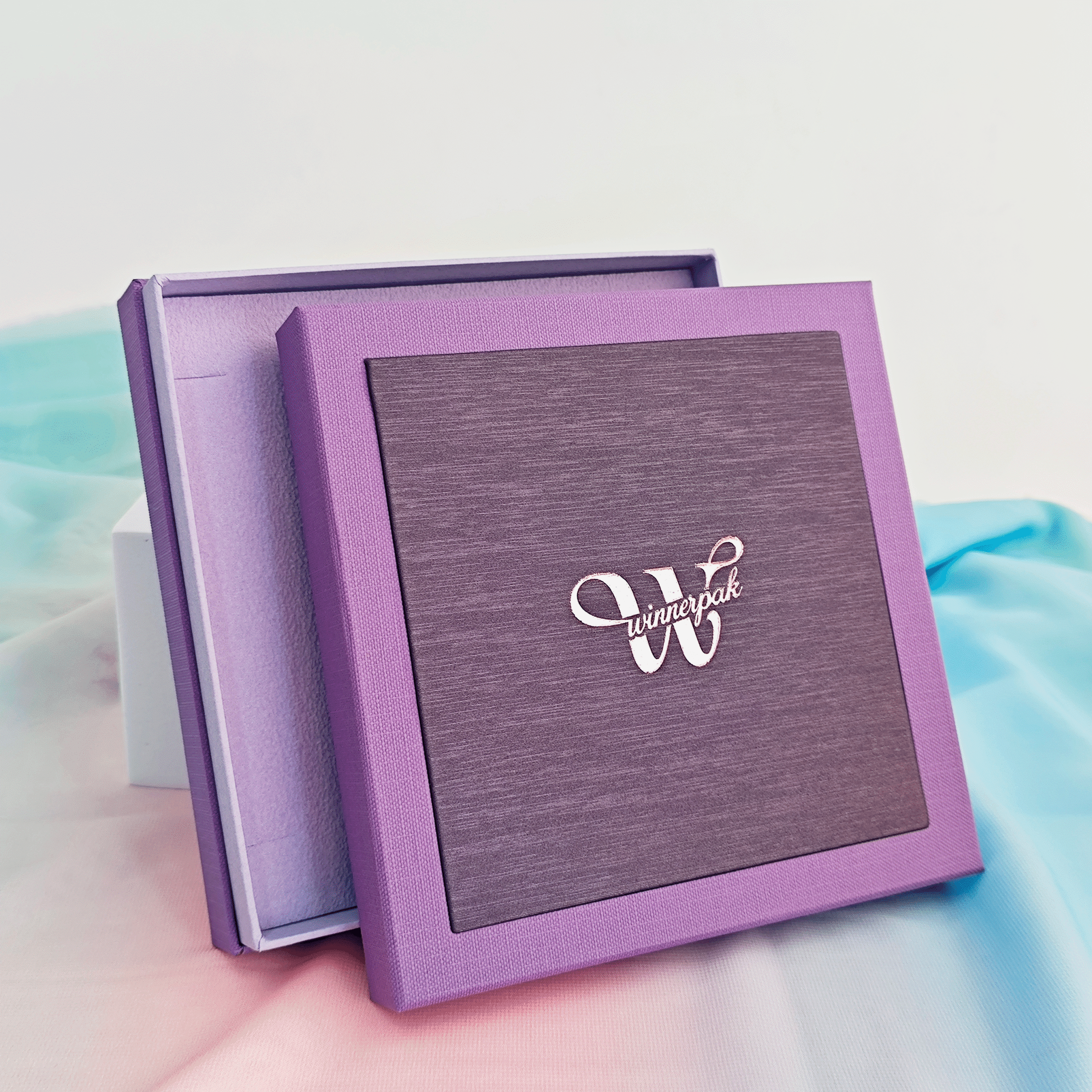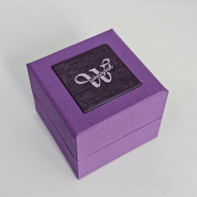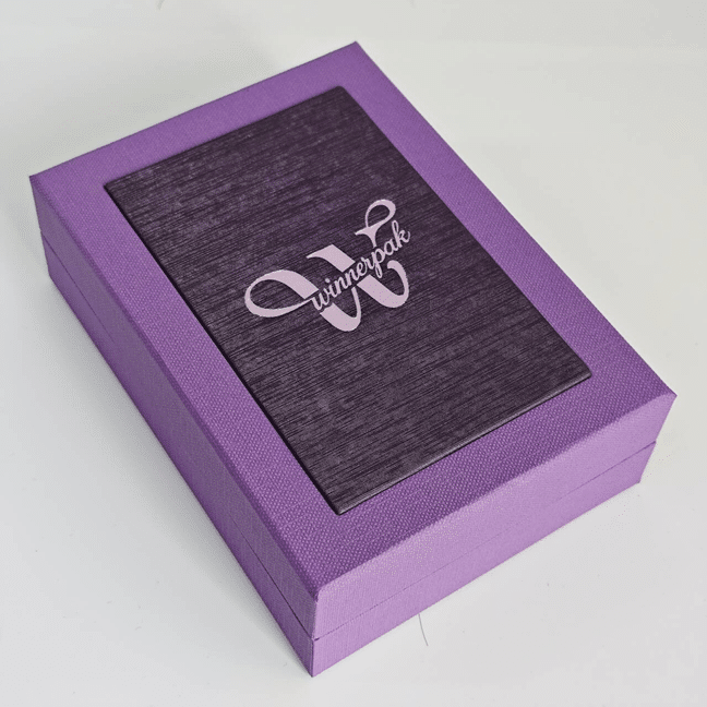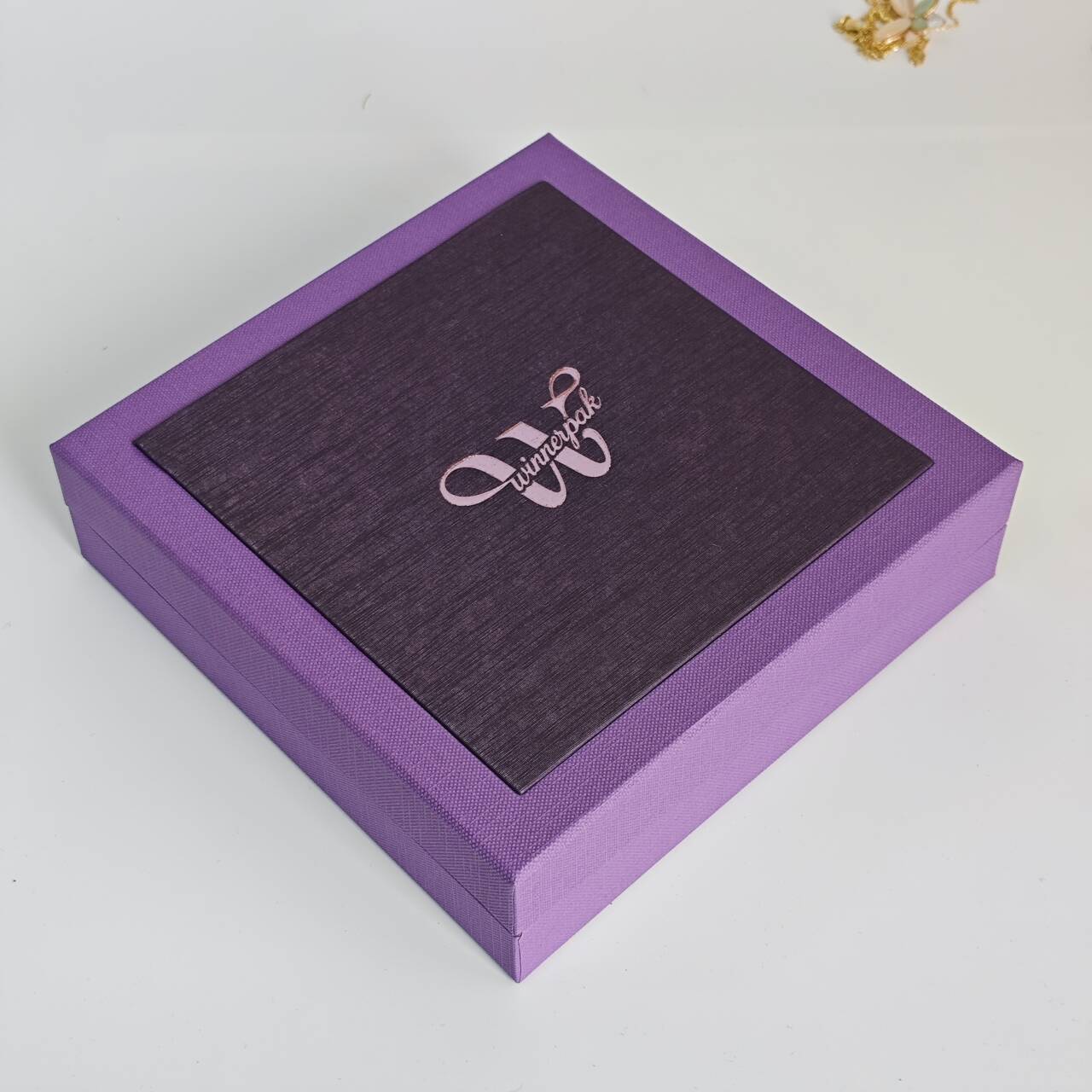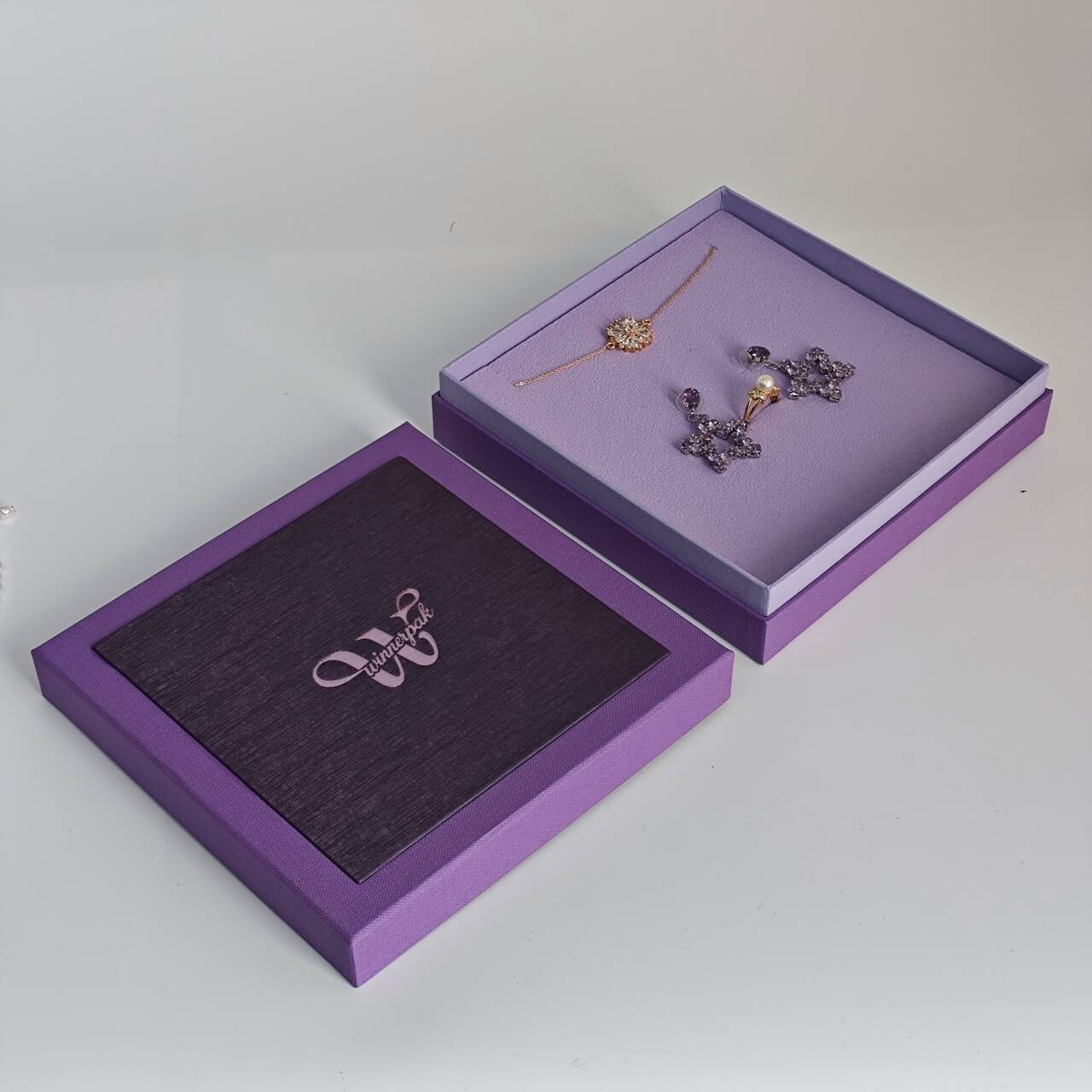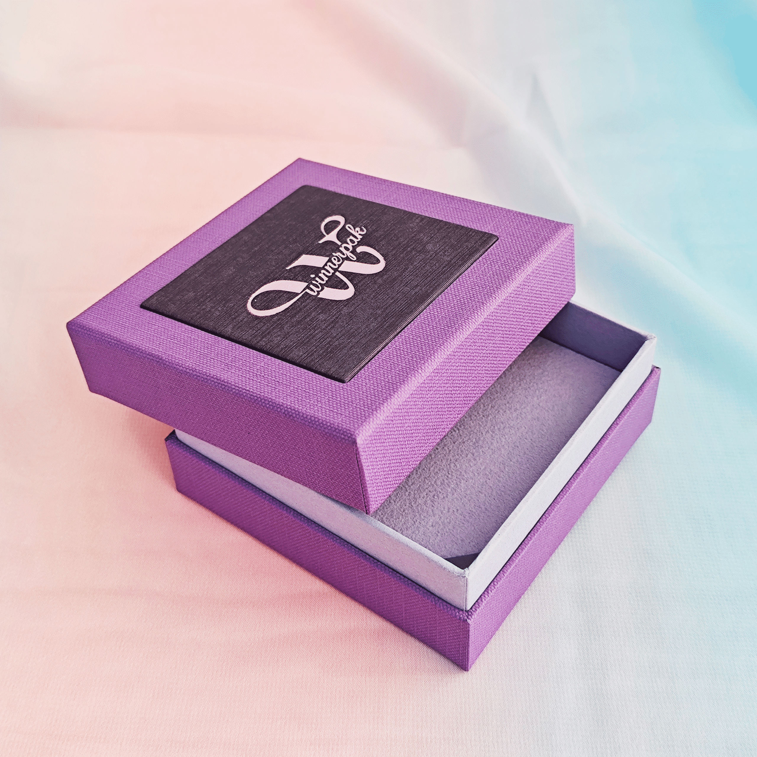 The Winnerpak DBTP-PL series instantly elevates your jewelry presentation with a luxury two-piece rigid cardboard paper box wrapped in purple fancy Oxford-texture embossed specialty paper and completed with a purple silk-leather (PU) branding pad centered on the lid. DBTP-PL is designed for retail display and giving, with a clean, modern appearance and a soft, protected interior.