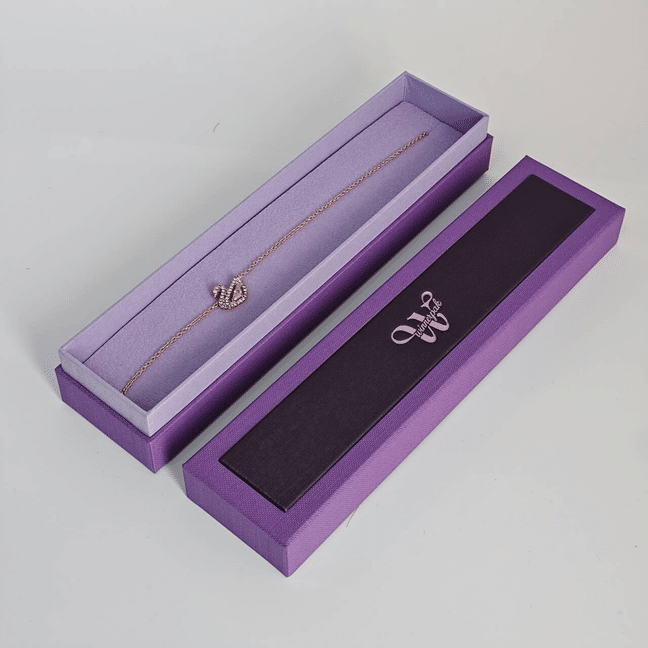 This is a classic two-piece lift-off lid design (gift box style). Your customers will find a color-coordinated purple interior and a soft padded liner to keep their jewelry safe and scratch-free. It’s an excellent jewelry gift box for high-value products.