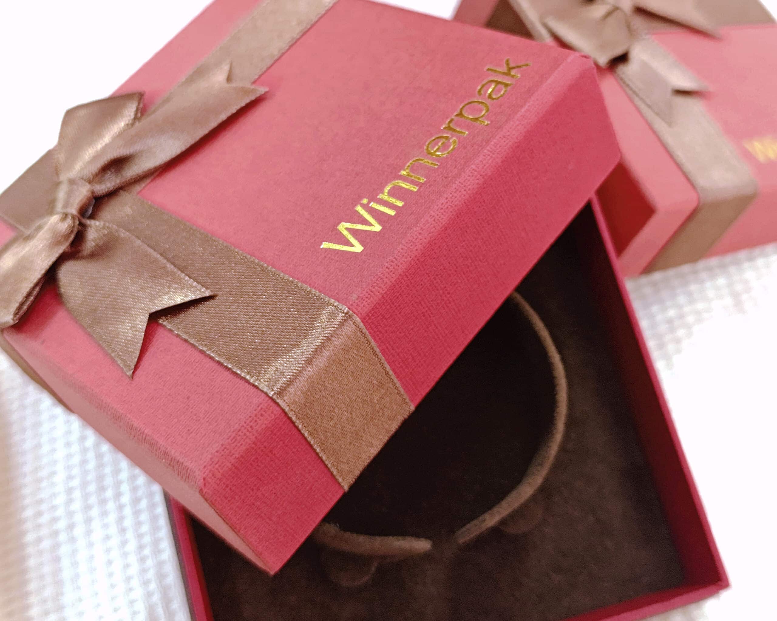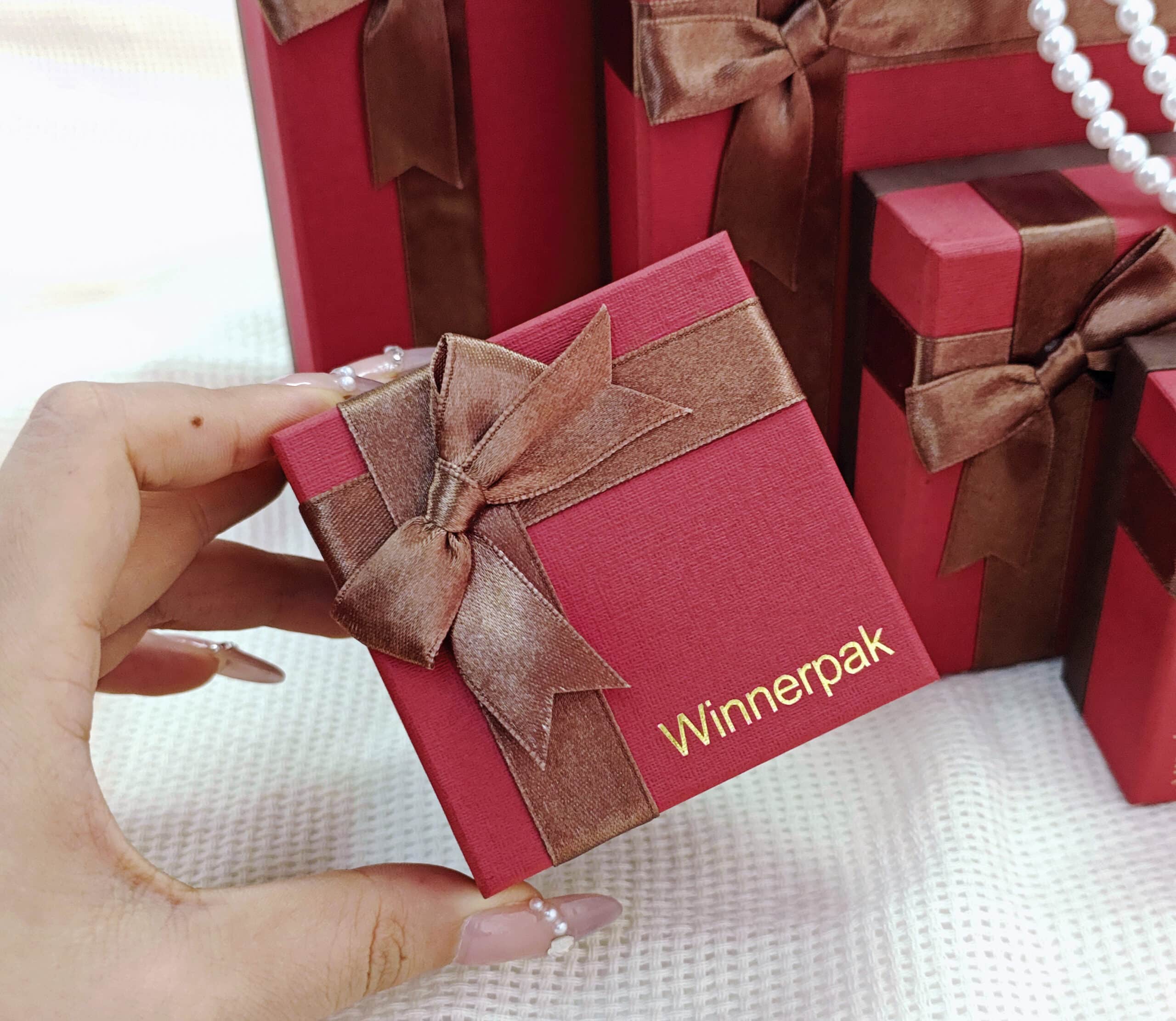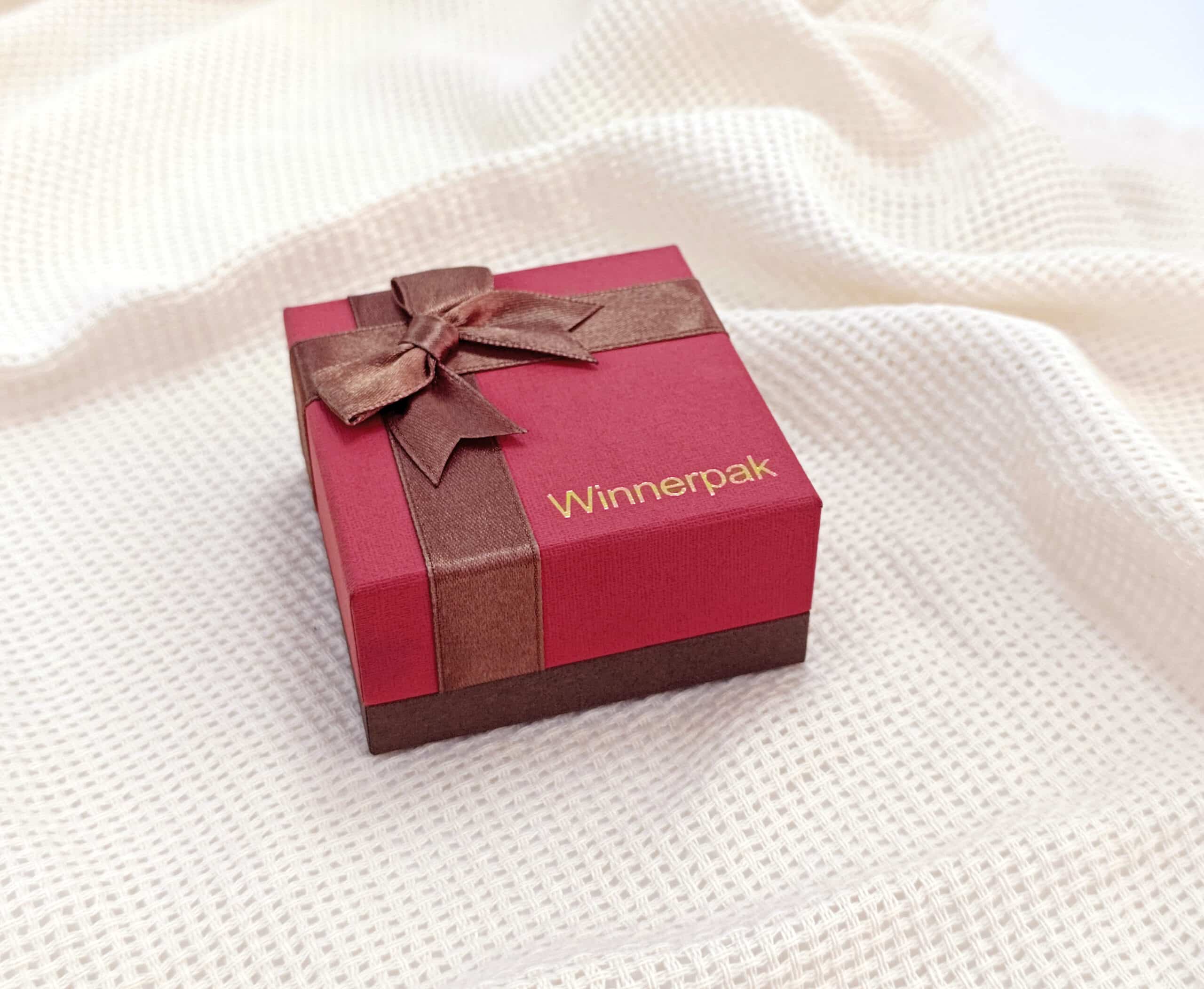 With the Winnerpak DNTP-RD Collection, you can create a truly gift-ready unboxing—a premium 2-piece packer jewelry box made of 1000gsm firm cardboard, wrapped in textured fancy paper, and completed with a brown satin ribbon bow glued/fixed to the lid for a consistent luxury look.