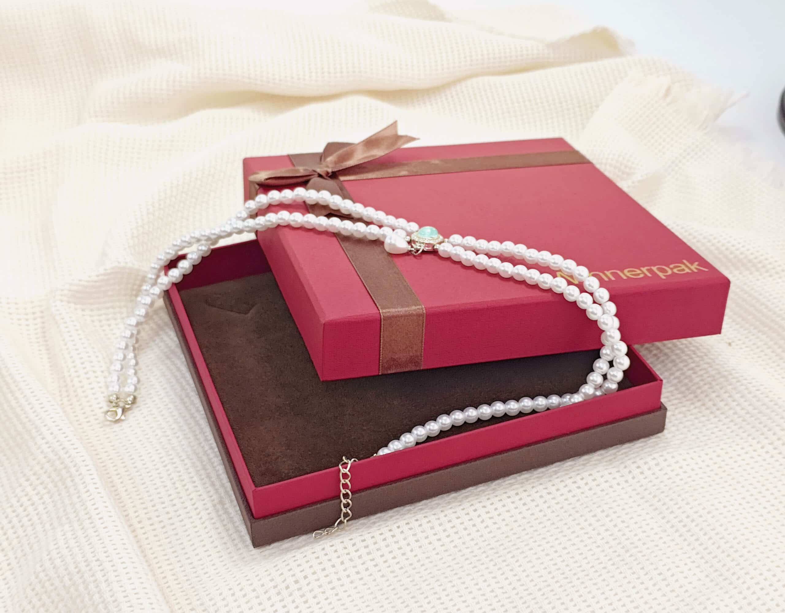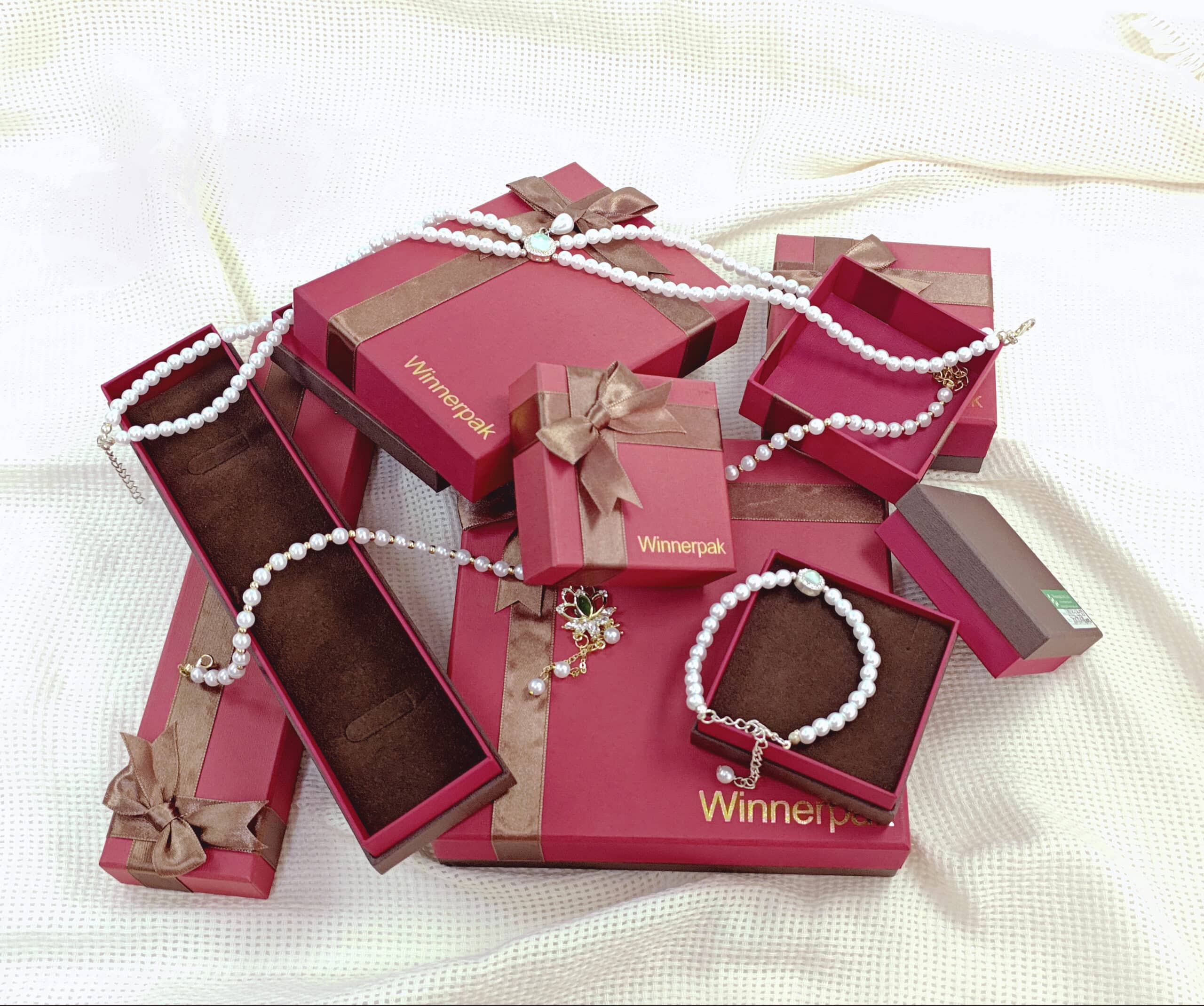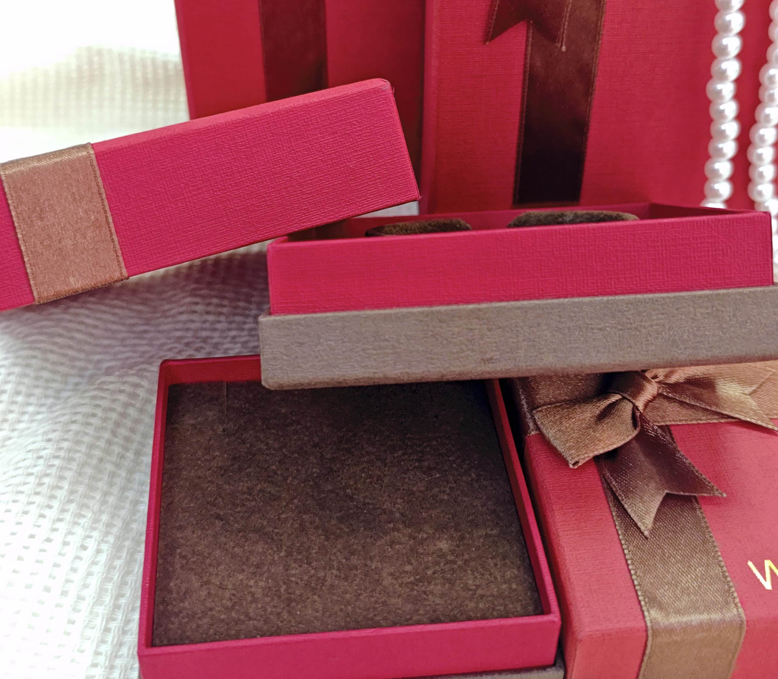With the Winnerpak DNTP-RD Collection, you can create a truly gift-ready unboxing—a premium 2-piece packer jewelry box made of 1000gsm firm cardboard, wrapped in textured fancy paper, and completed with a brown satin ribbon bow glued/fixed to the lid for a consistent luxury look.