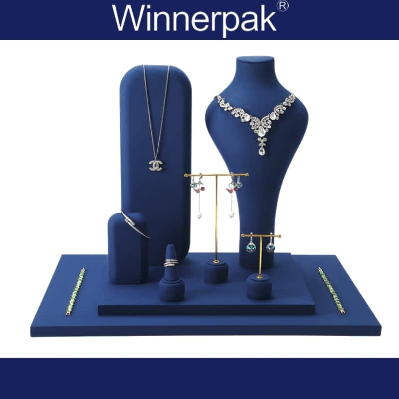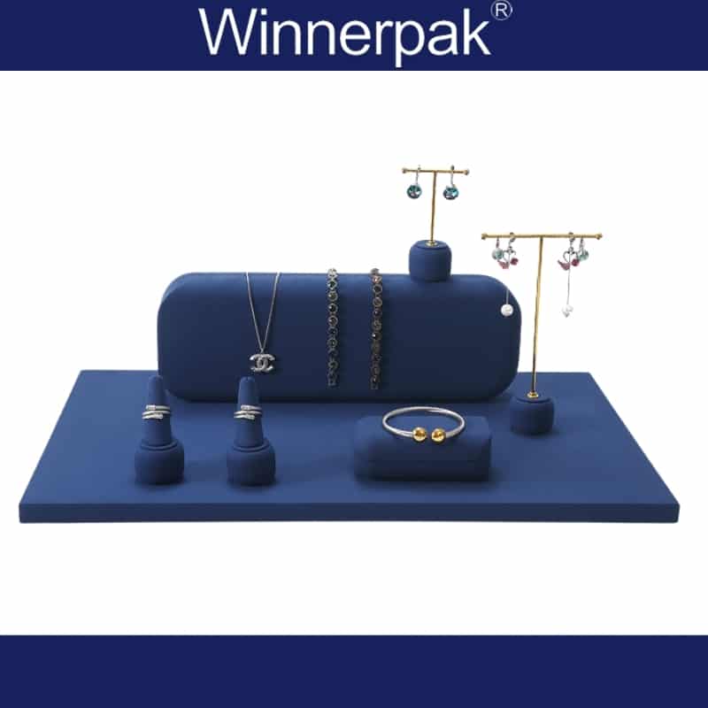 Upgrade your displays with this stunning navy blue suede jewelry display set.