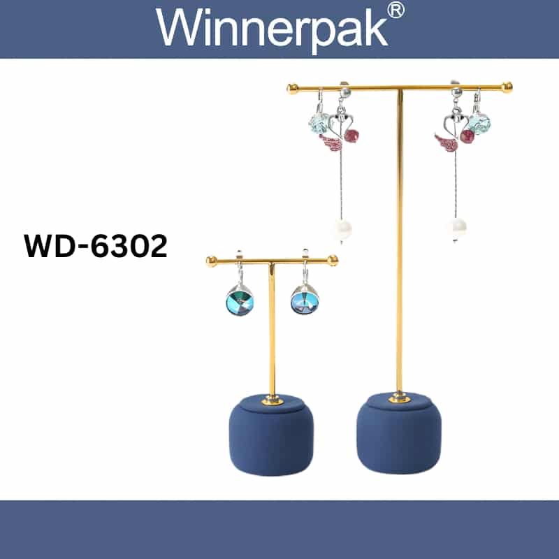 | WD‑6302 | Earring T‑Bar Display (Set of 2) | 4 × 4 × 10 / 17.5 | 135 | EVA + Metal + MDF | Navy Blue Suede + Gold Rod | Earring display — short & long lengths |