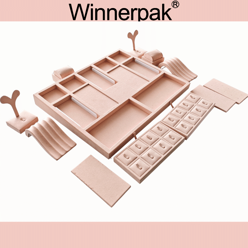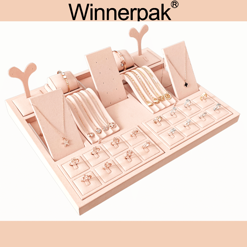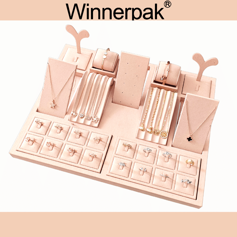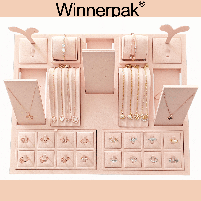Luxury jewelry stores frequently use this jewelry display set for window displays, countertop showcases, and retail presentations because of its low-height recessed design, soft pink microfiber finish, and expert MDF construction. It enhances visual marketing and brand image by fusing a sleek, contemporary design with a useful jewelry display.