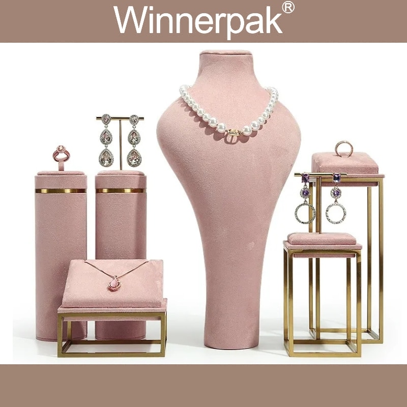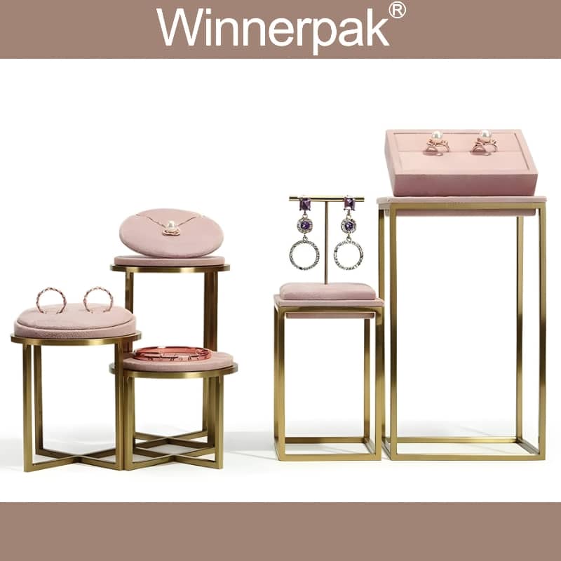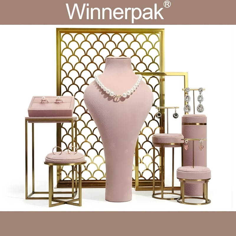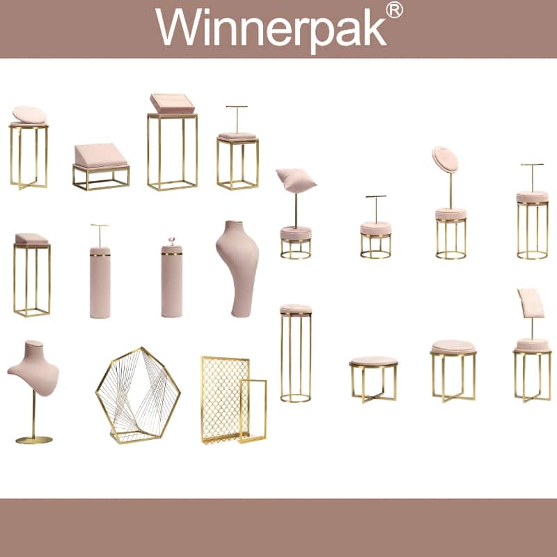 Winnerpak Jewelry Display Set B, featuring gold-plated stainless steel and soft-touch pink suede, is a boutique-style display set ideal for high-end jewelry packing and imaginative presentation. This matched set of ring stands, earring holders, bracelet and necklace stands, busts, and geometric backdrop frames enables jewelry businesses to create luxury jewelry packaging scenarios for window displays, retail counters, trade exhibitions, and photography.