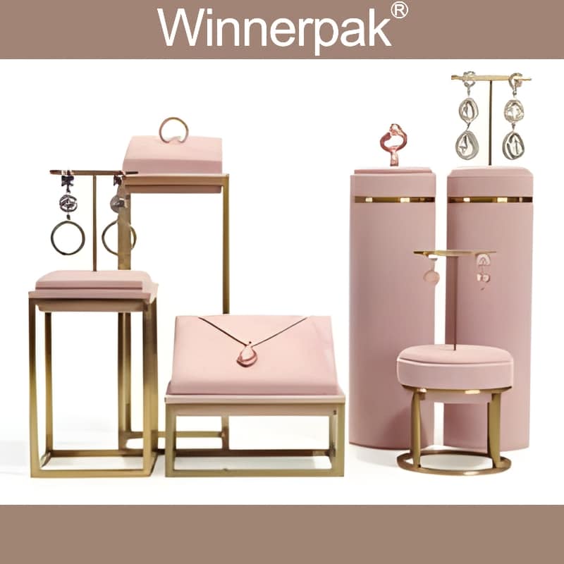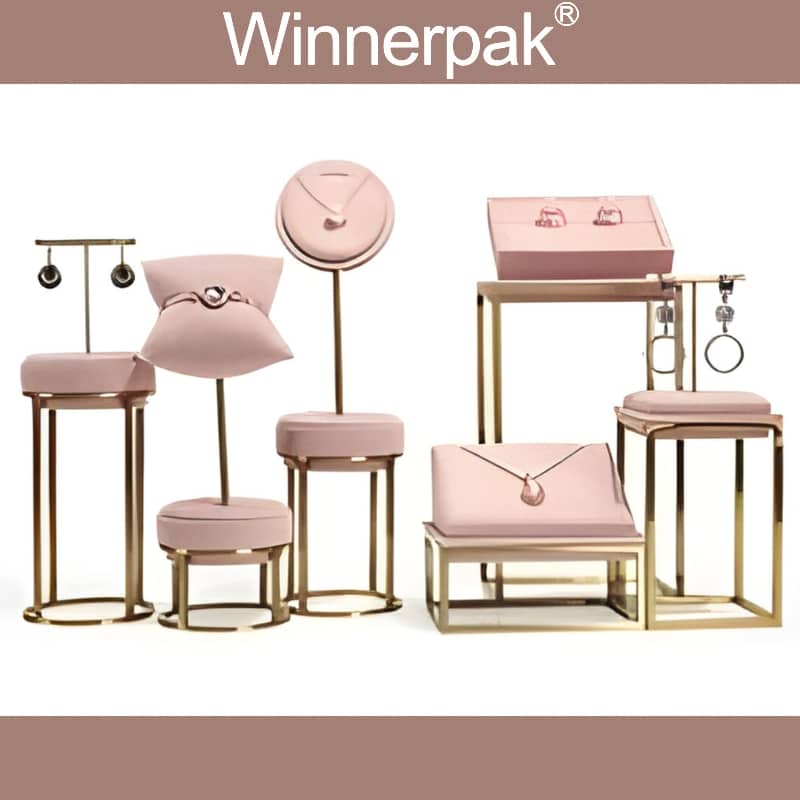 Winnerpak creates and manufactures this set for wholesalers and brands seeking creative jewelry packaging, one-of-a-kind jewelry box displays, and consistent jewelry packaging for small businesses and huge chains. The soft pink suede surface preserves fine jewelry, while the warm gold metal creates a premium boutique atmosphere that complements luxury jewelry boxes, bracelet boxes, necklace packing, and jewelry bags with logos.