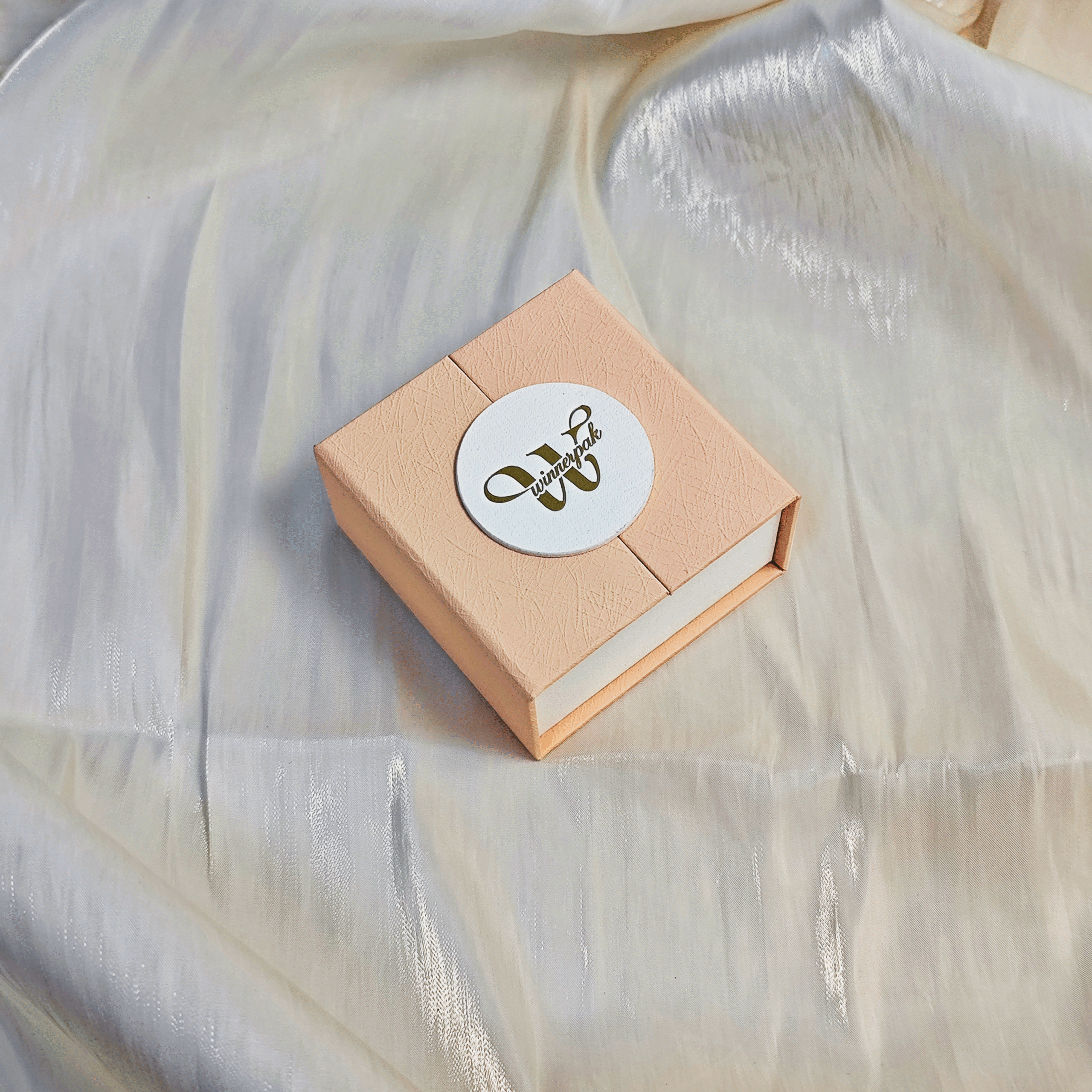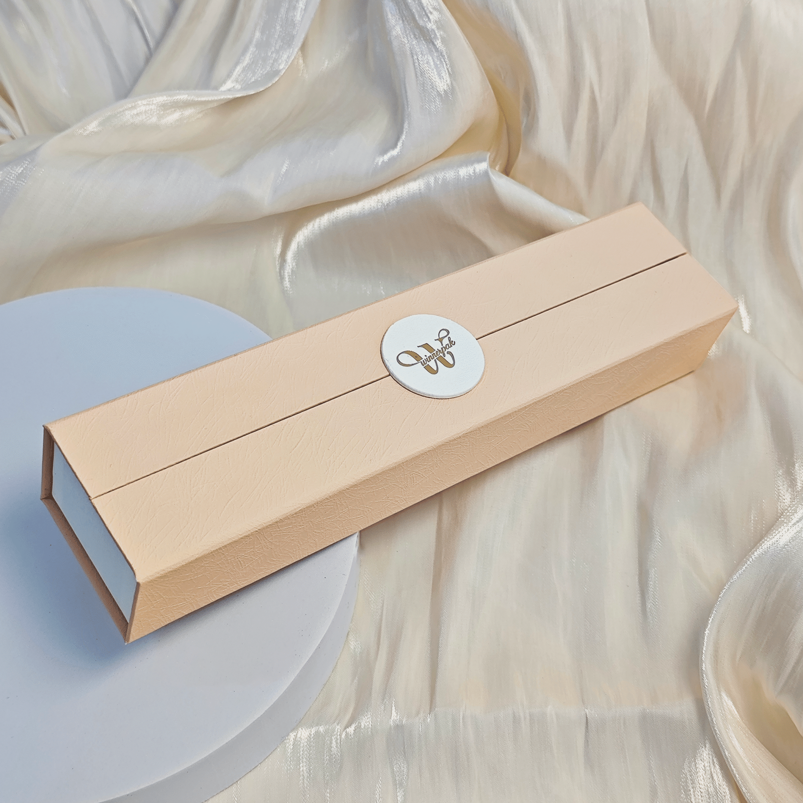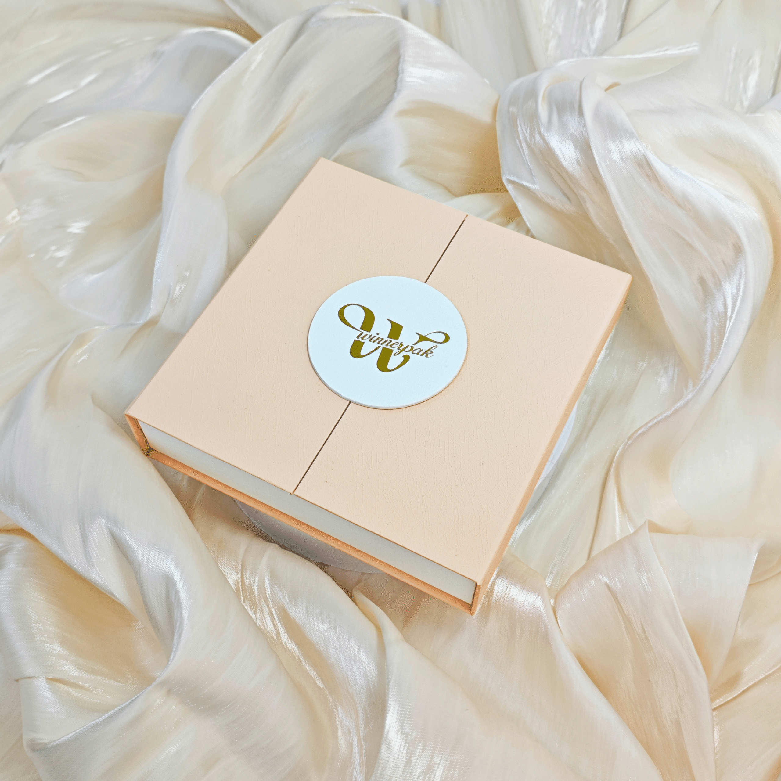 A: While the Peach/Beige color pictured is our stock choice, as a direct custom package manufacturer, we can create this exact “double-door” form in any hue. Popular custom colors include matte black, sage green, navy blue, and pure white.