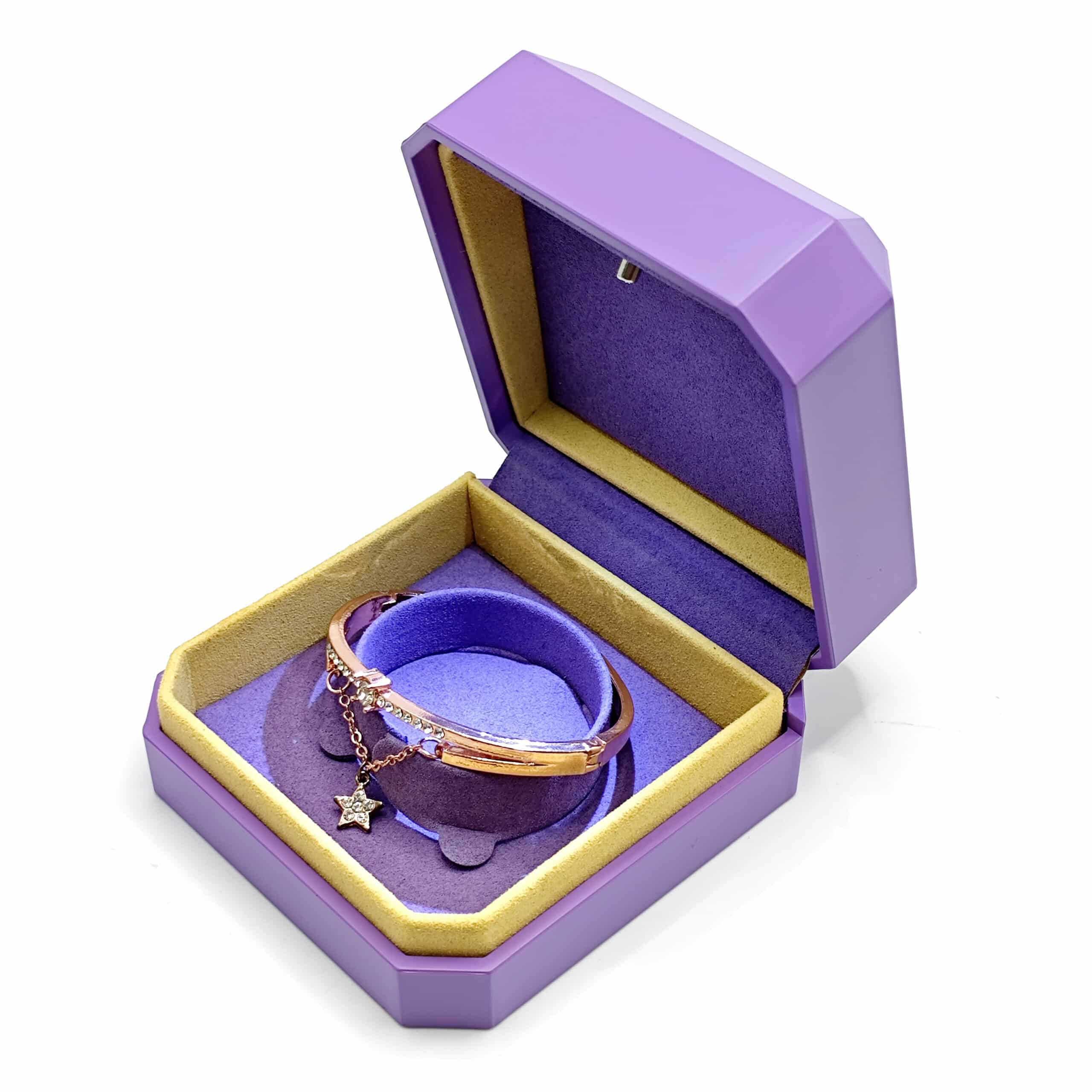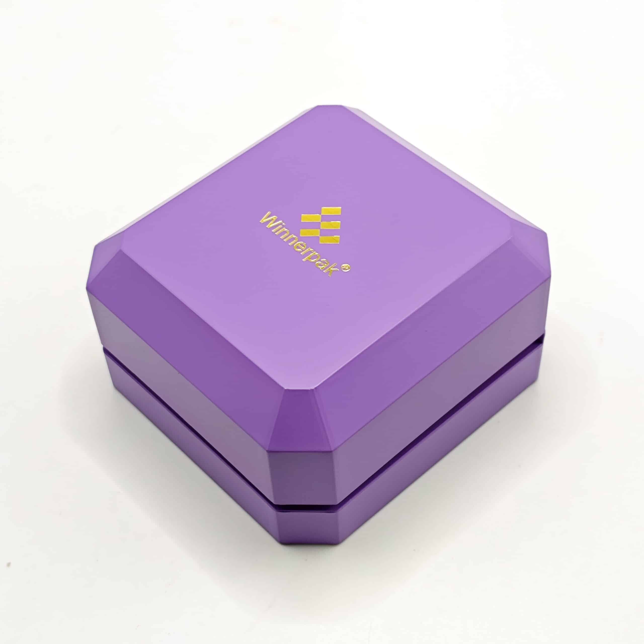 The LE03‑PR series is a high-end, Messika-style jewelry box with an LED light in the lid that will enhance your proposal and unwrapping moments. The interior has matching purple microfiber suede inserts with a yellow suede wall accent, the PS stiff frame is finished in an exquisite purple matte, and the four corners are carved at an angle. Put your unique brand’s logo inside the lid liner or in the middle of the lid (MOQ 1000 pieces).
