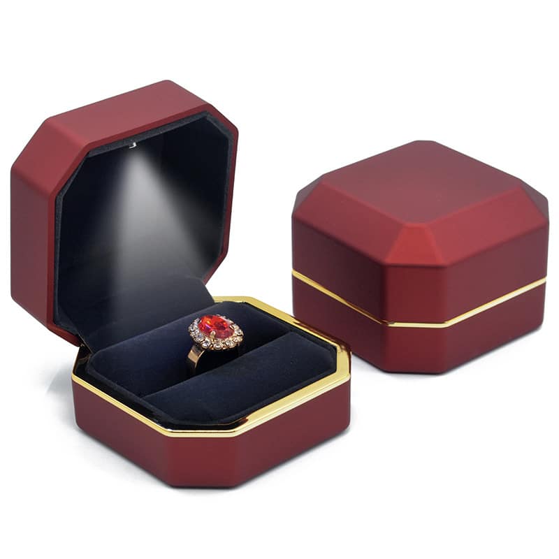 Cut corner wine red painting LED Jewelry Box With gold trim line.
