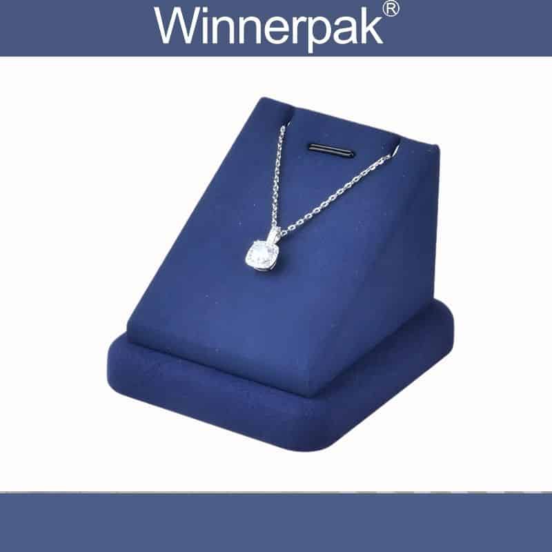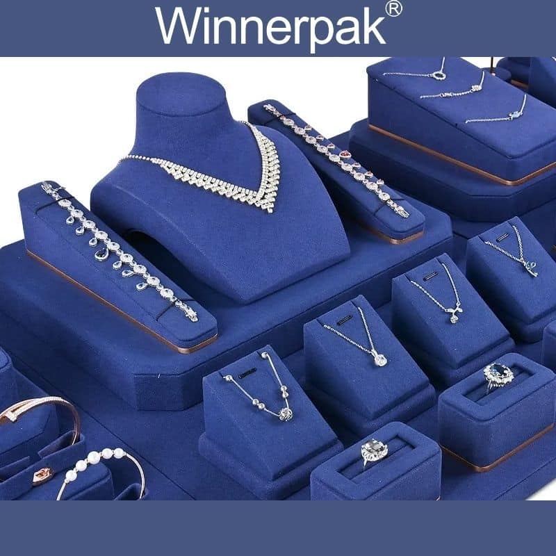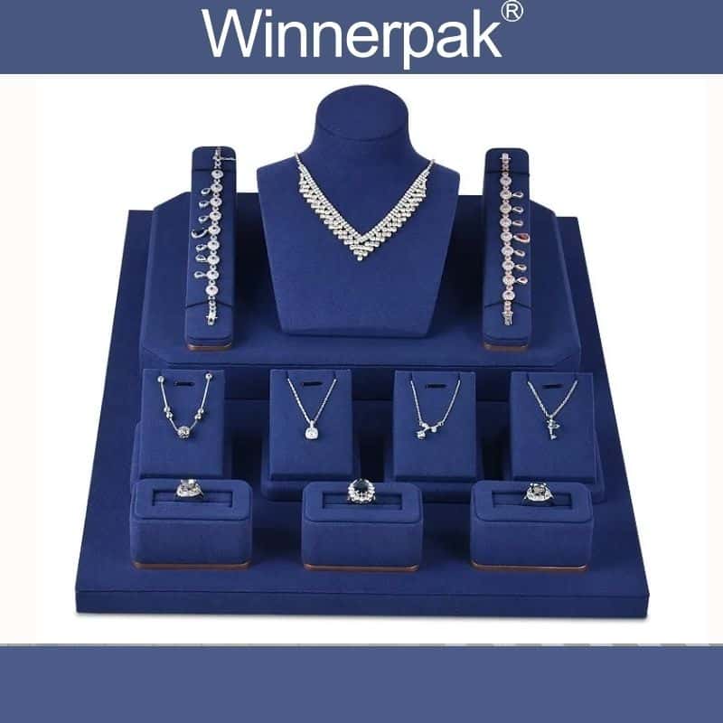 The Luxury Jewelry Display Set L by Winnerpak is a high-quality, hand-made way for jewelry stores, brand boutiques, and trade shows to show off their jewelry. Each unit is covered in gorgeous navy blue microfiber suede, which gives it a polished and uniform look for displaying high-end jewelry.
