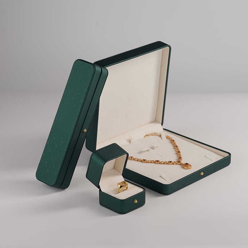 Green PU exterior + off‑white suede velvet interior that highlights jewelry in photos and showcases