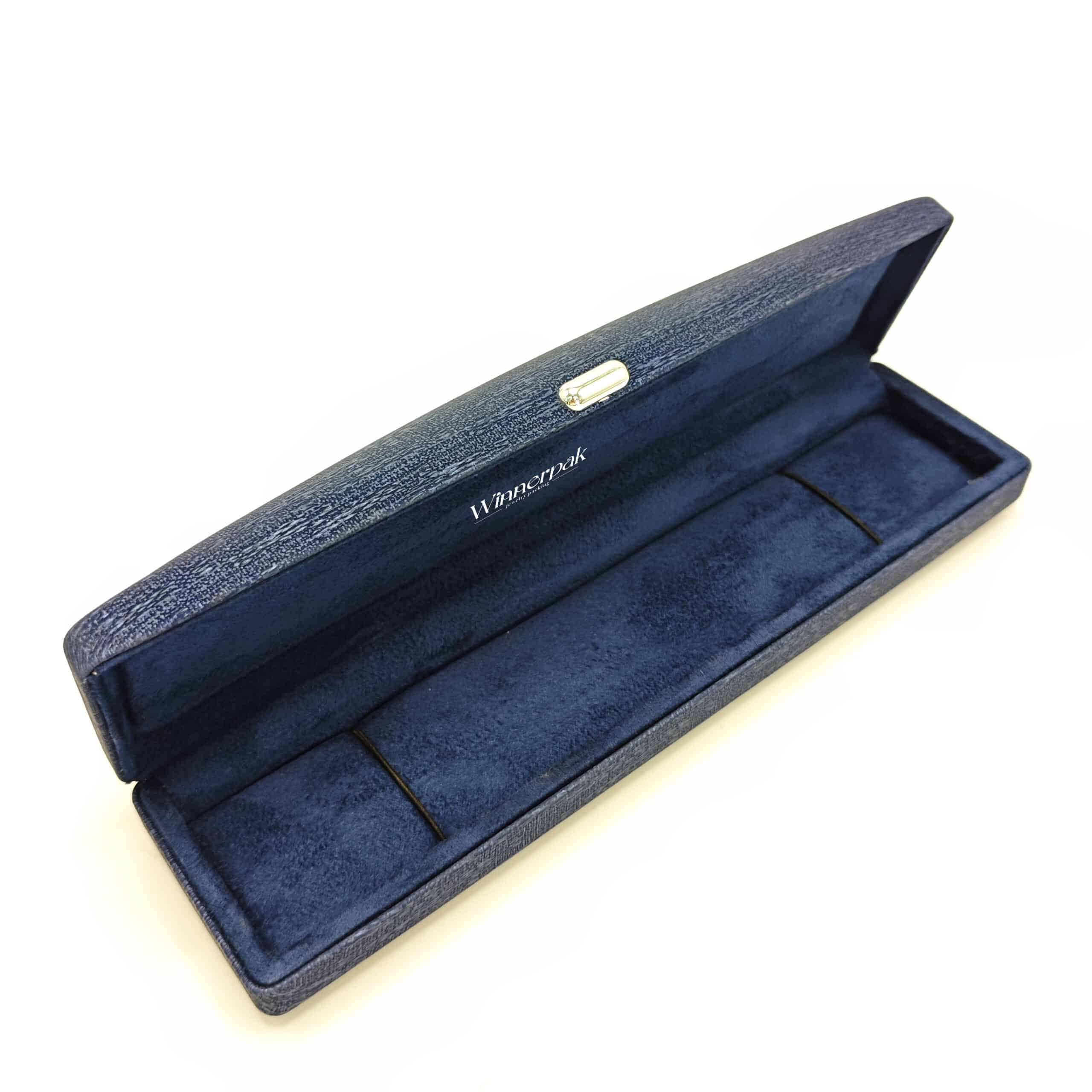 The Winnerpak RL08 Collection, a premium collection of navy blue leatherette jewelry boxes created for luxury merchants and high-end brands, can help you elevate your brand presentation. This line, with its exquisite cross-grain texture and distinctive decorative silver metal accent, has the look and feel of expensive baggage in a compact jewelry package.