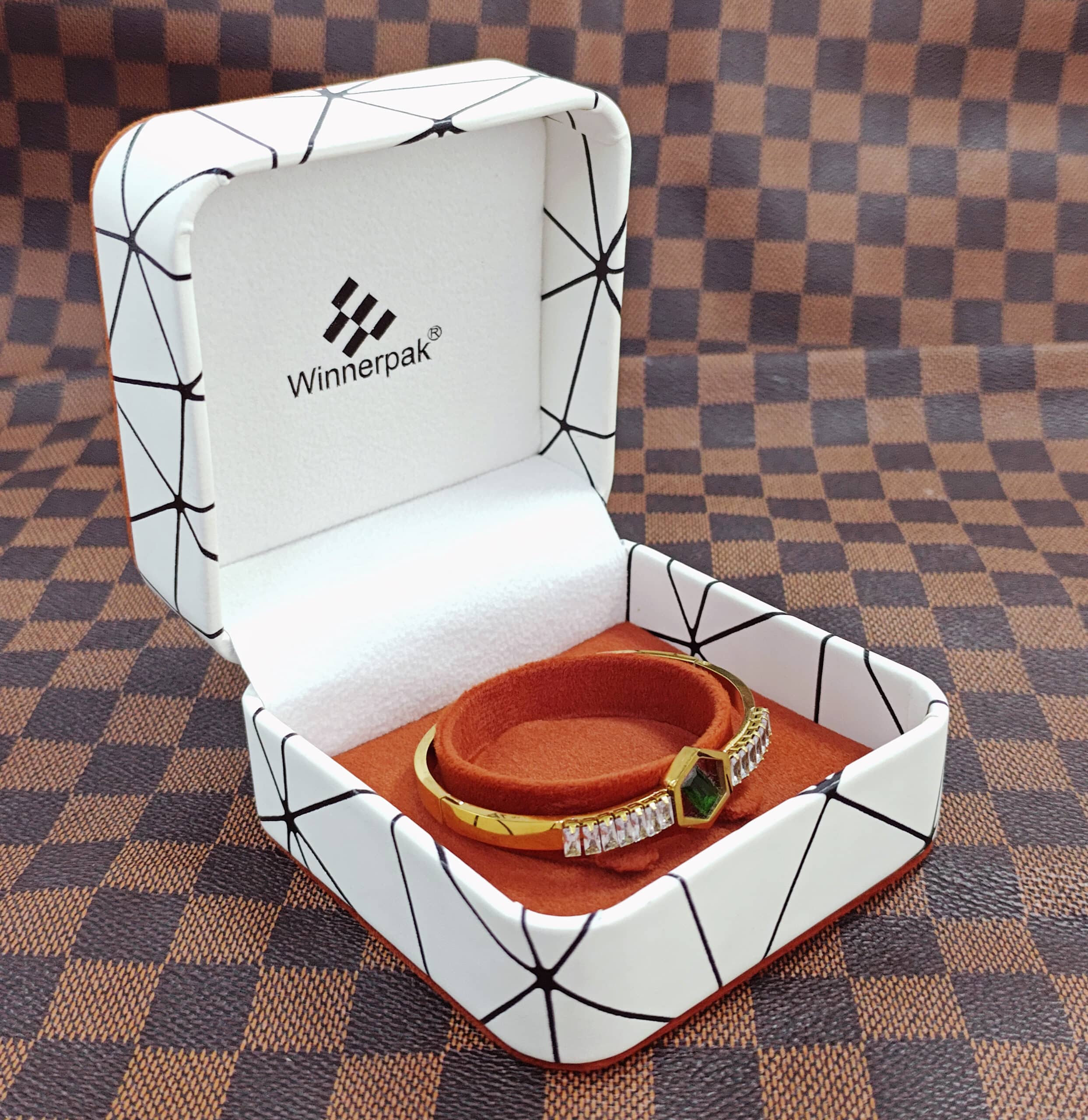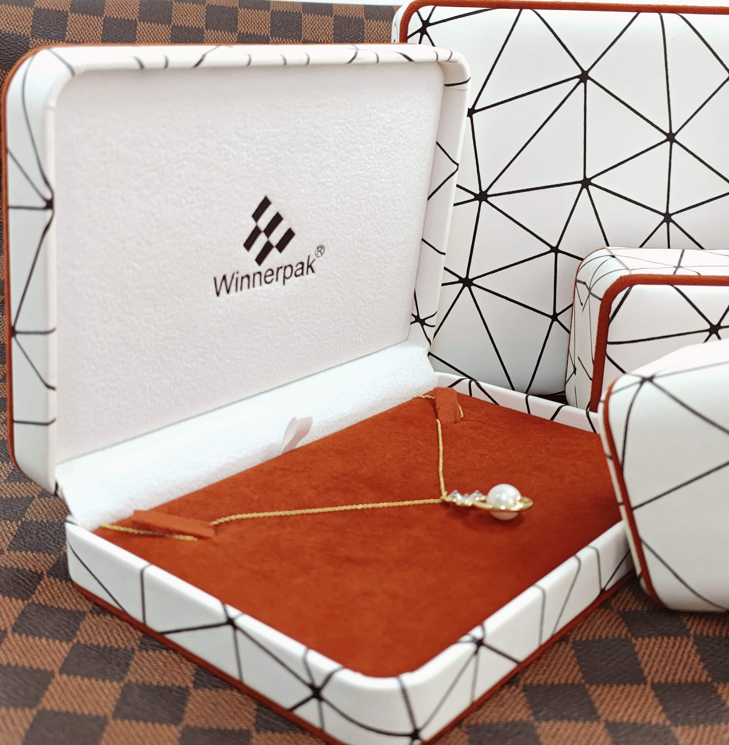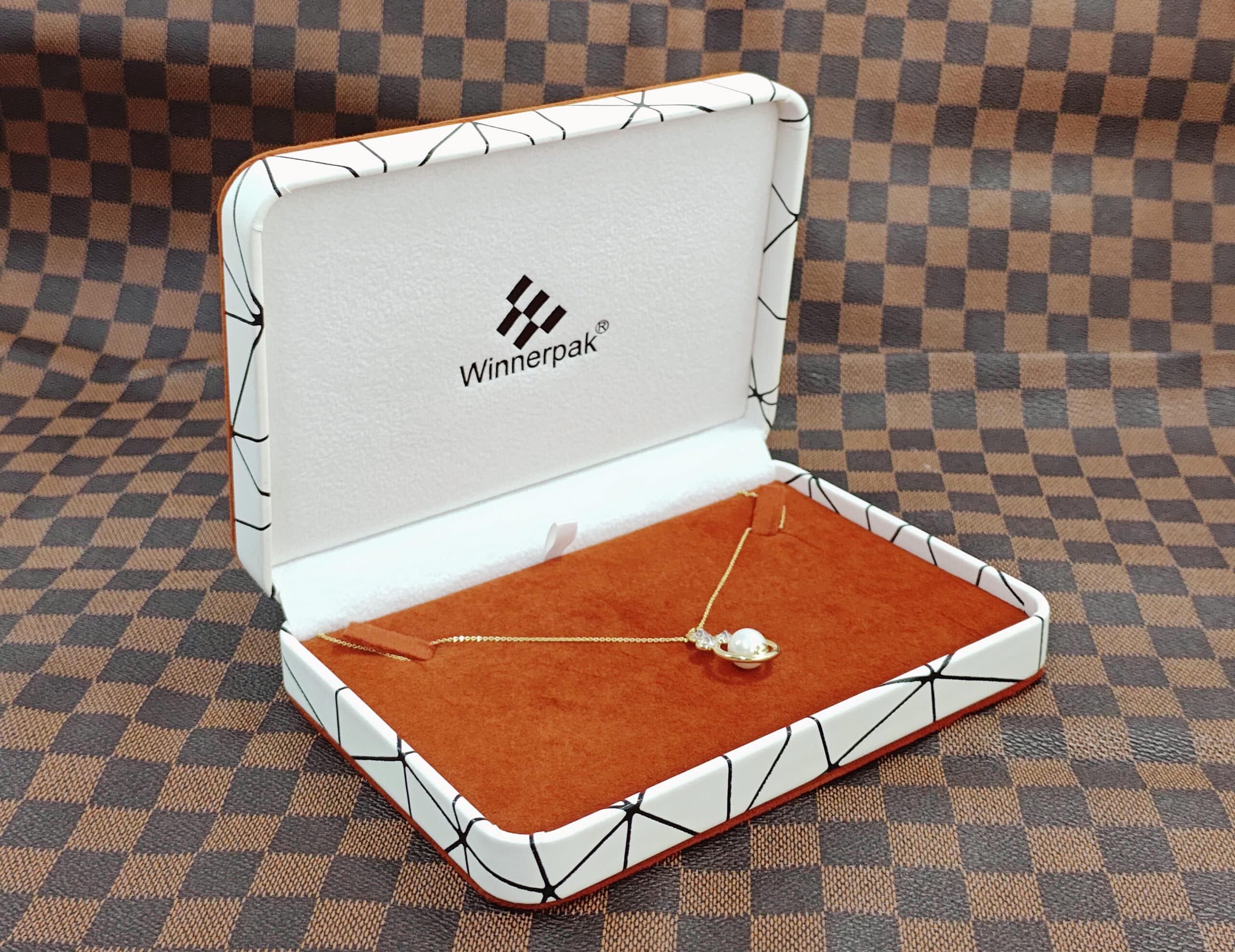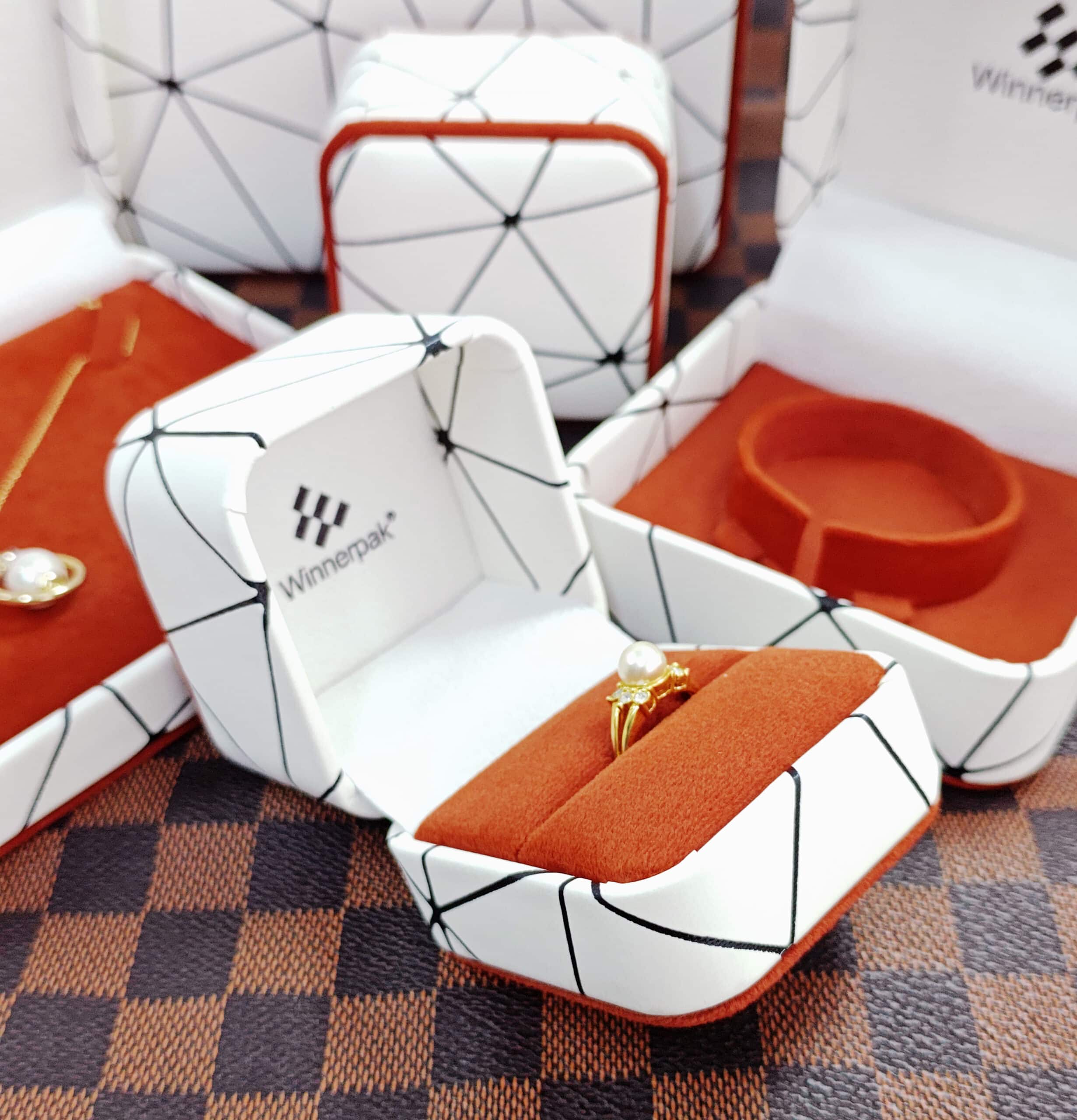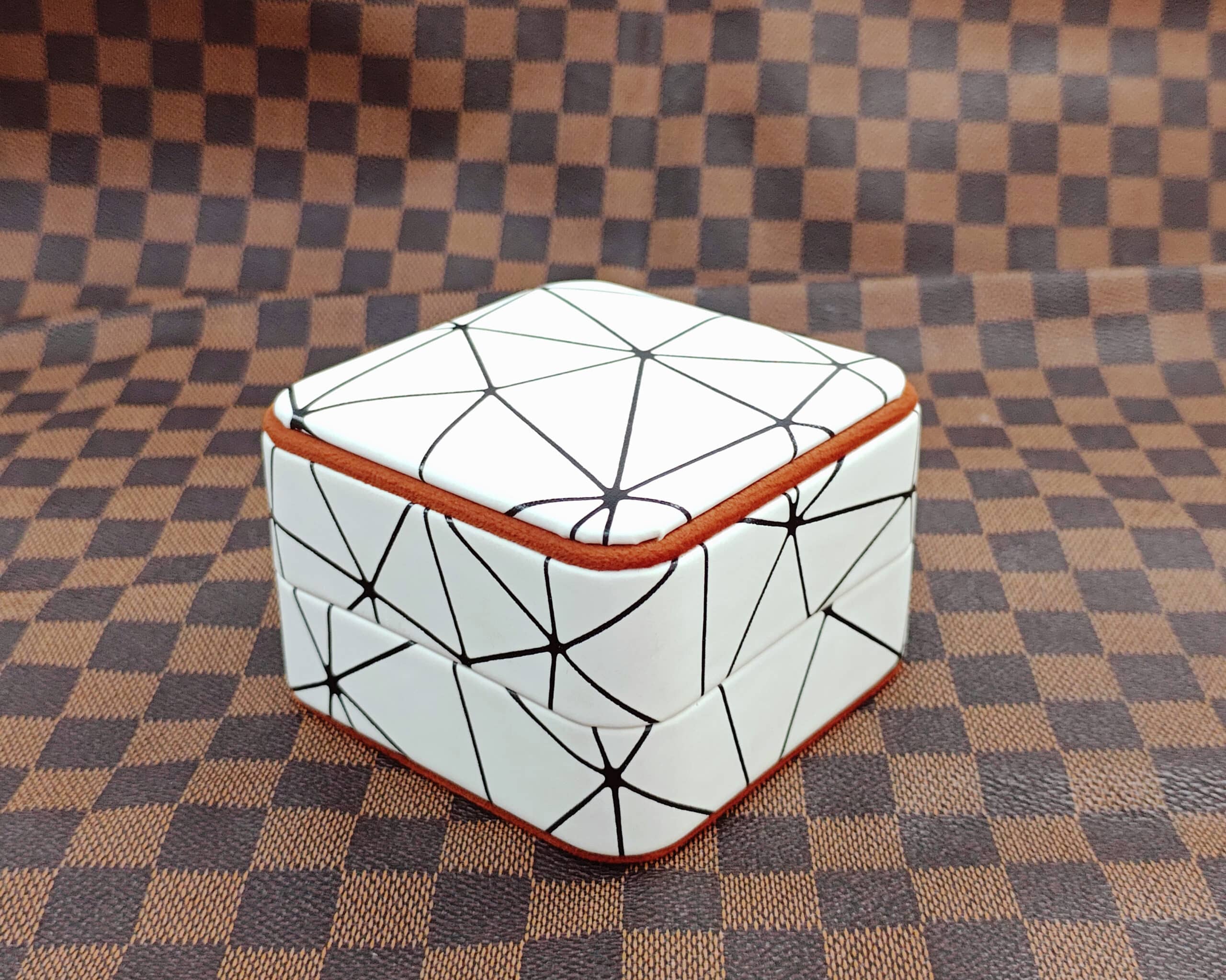 This series departs from usual solid hues, with a striking white PU leather exterior printed with a modern black geometric line pattern. The style is enhanced by burnt orange piping details along the edges, which complement the rich terracotta velvet interior. This unified color palette produces a pleasant, rich unboxing experience that makes gold and rose gold jewelry shine.