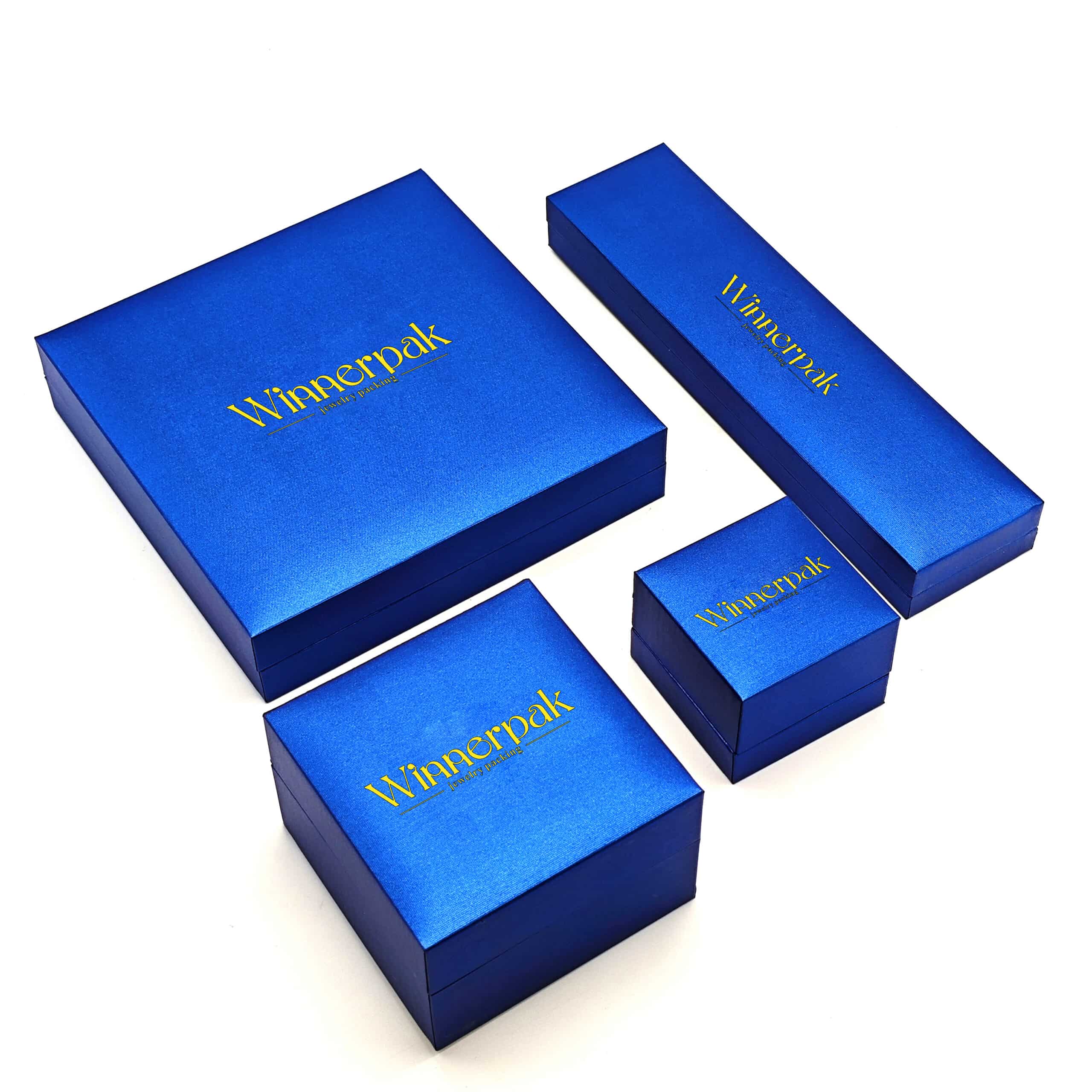 Enhance your brand presentation with the Winnerpak SC01D-RB series, a traditional straight-corner jewelry packing box set featuring a PS frame and wrapped in royal blue iridescent fancy paper. The interior features a soft, white velvet lining and fitted inserts for safe, premium display and gift-ready unwrapping.