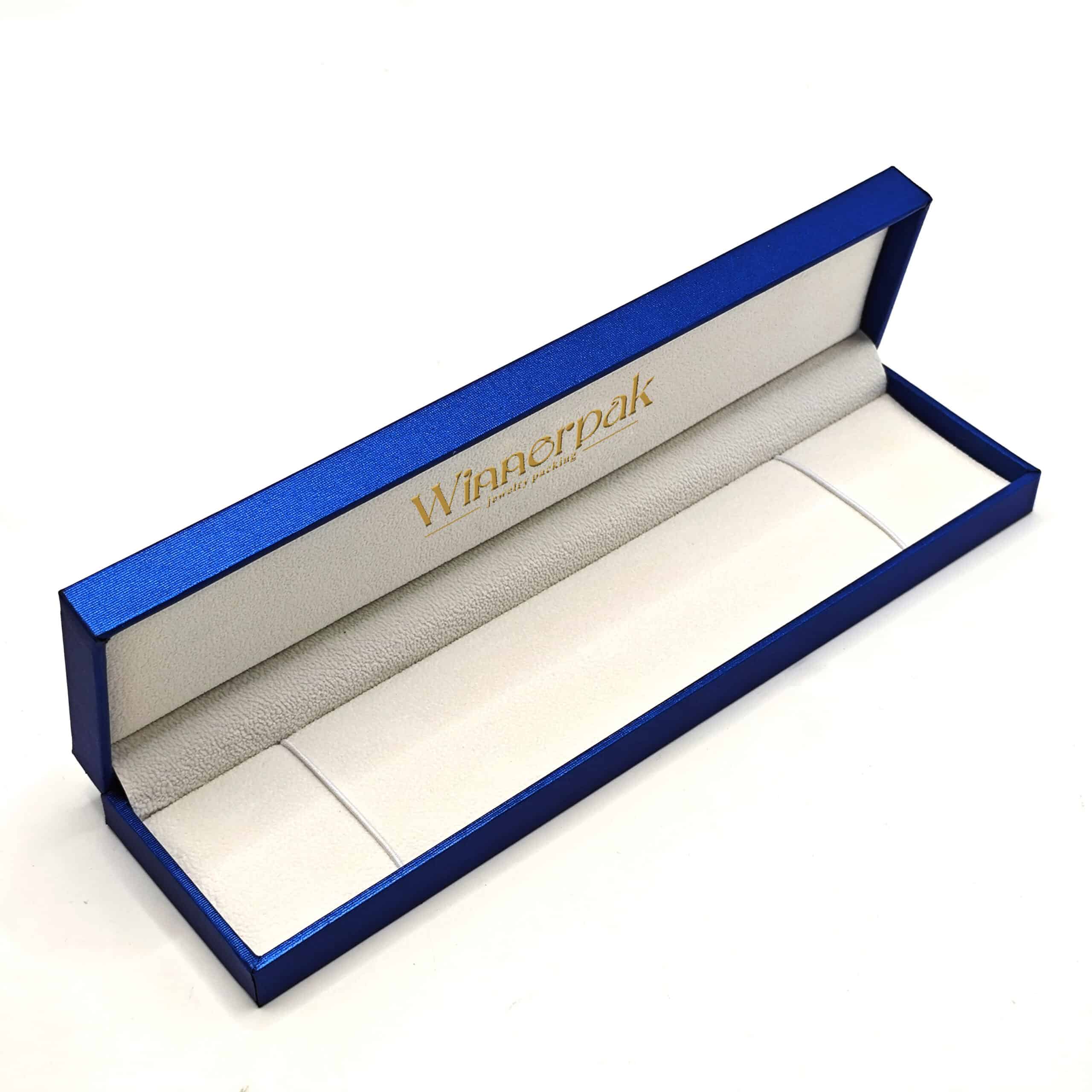Winnerpak SC01D‐RB is a premium jewelry packaging series constructed with a rigid PS frame, enveloped in royal blue pearlescent decorative paper, and complemented by a soft white velvet interior liner with fitted inserts. This traditional-style collection with straight corners is designed for jewelry brands requiring wholesale jewelry packaging, including gift boxes and transportation boxes, available in a comprehensive range of sizes.