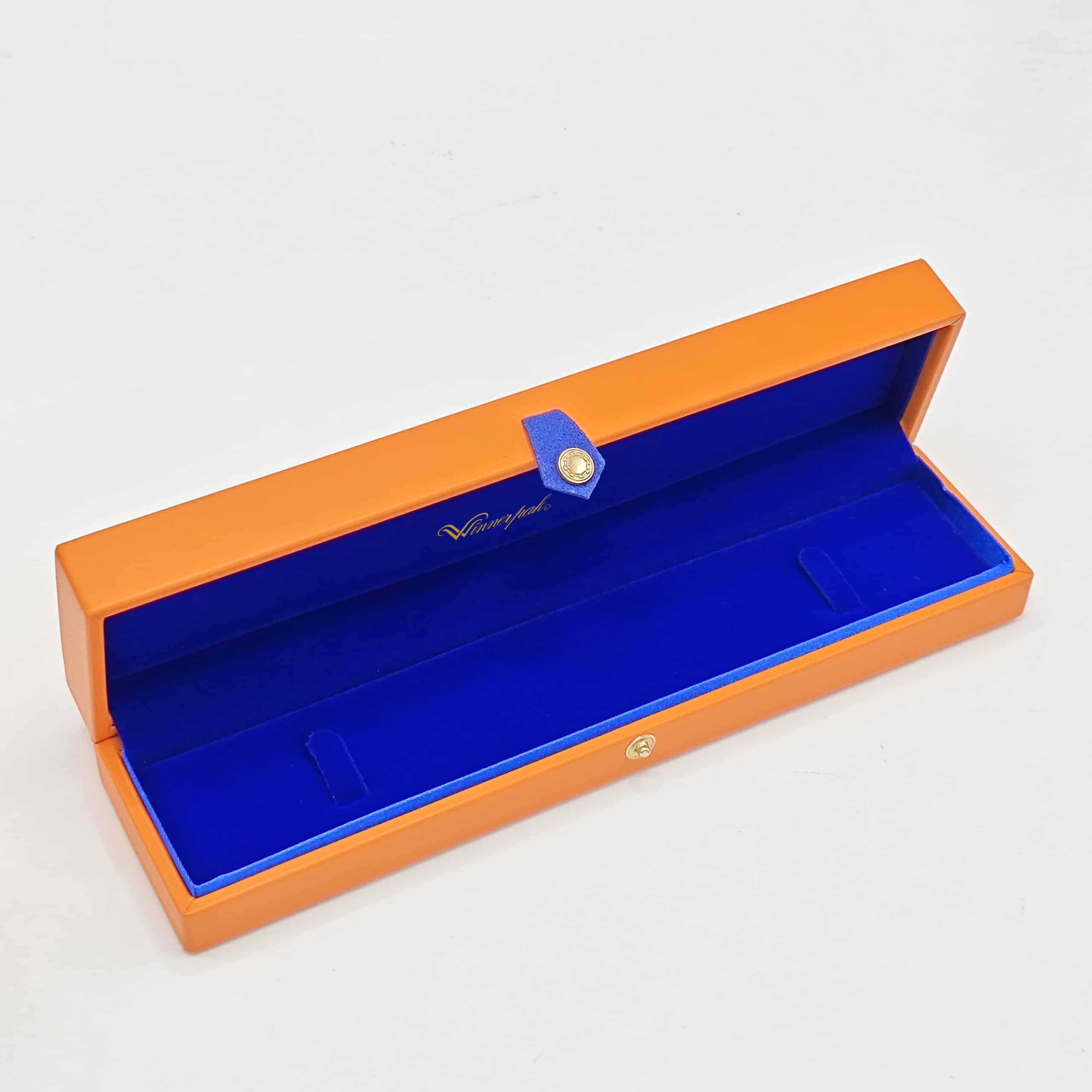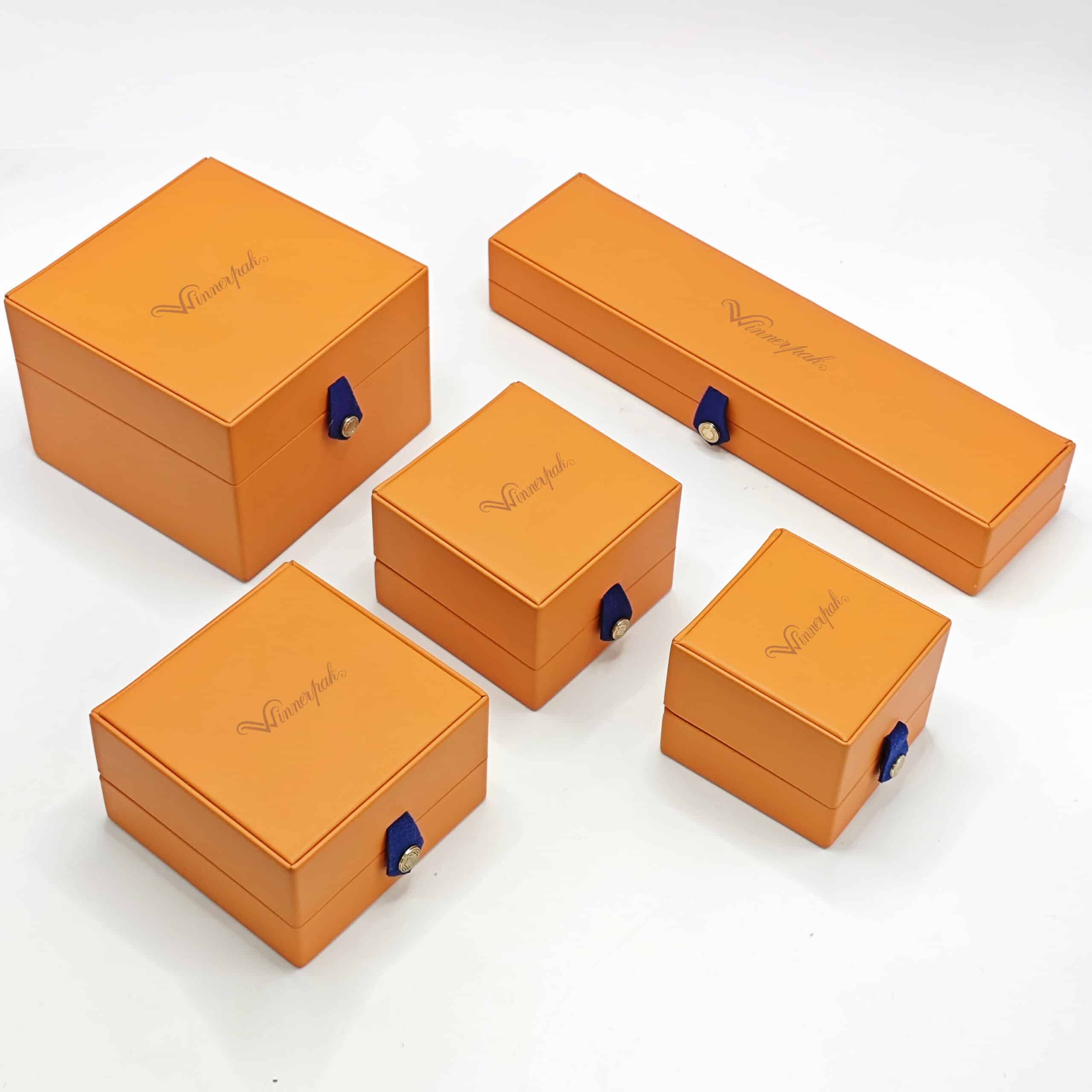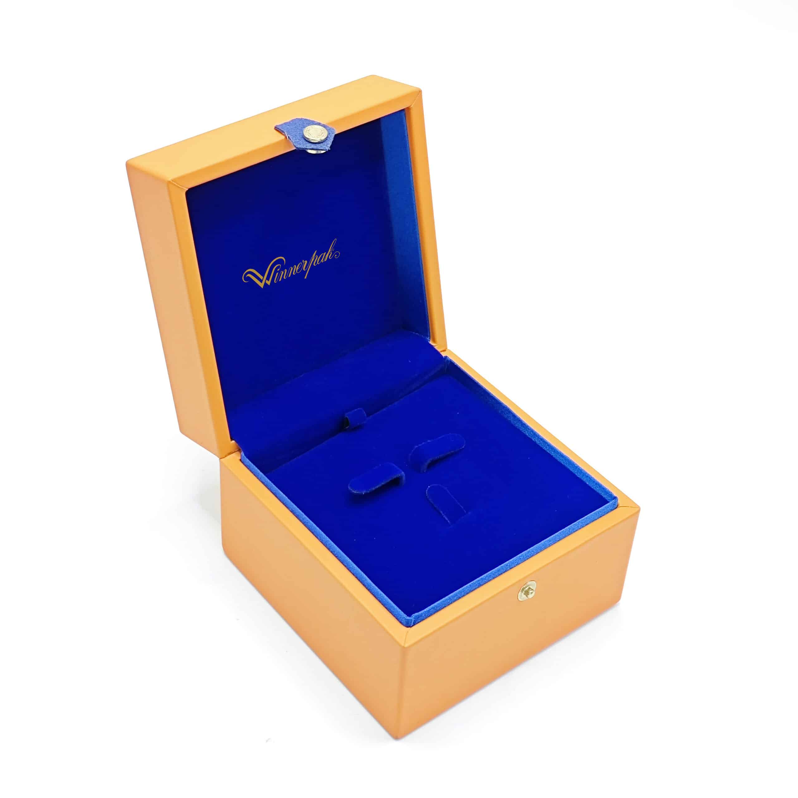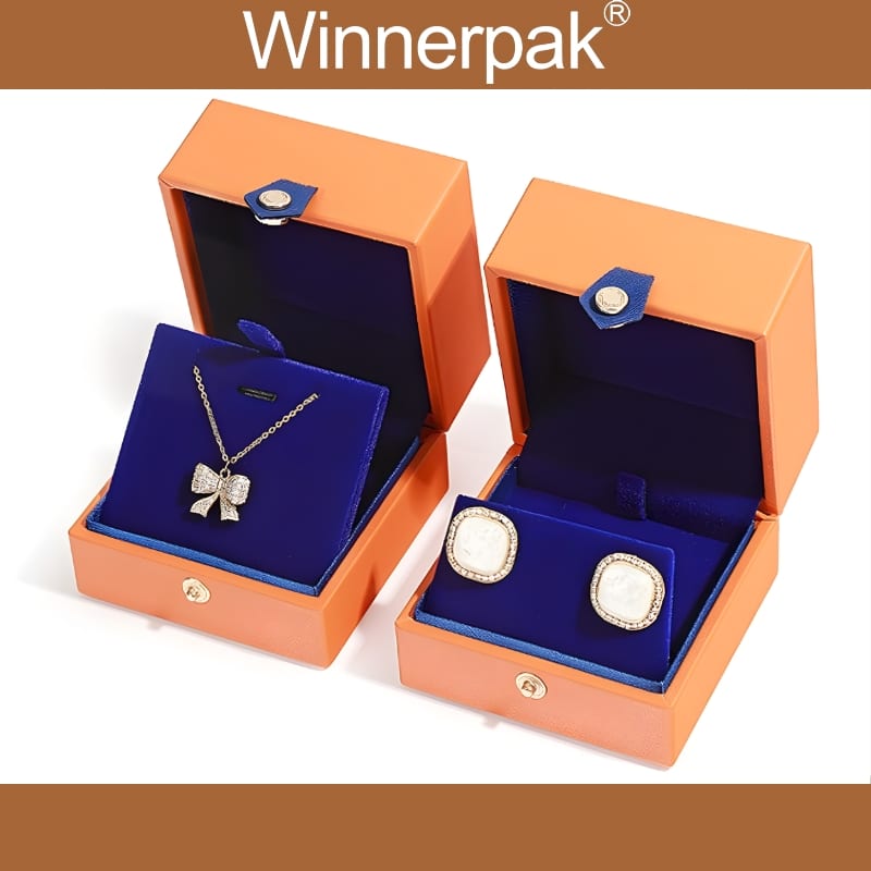 The Winnerpak SC19B Jewelry Box Series is a great way to package high-end jewelry in a way that is both classic and modern. The boxes are covered in Hermès Orange leatherette and have a beautiful navy blue velvet lining on the inside. The colors and textures are very different from each other.