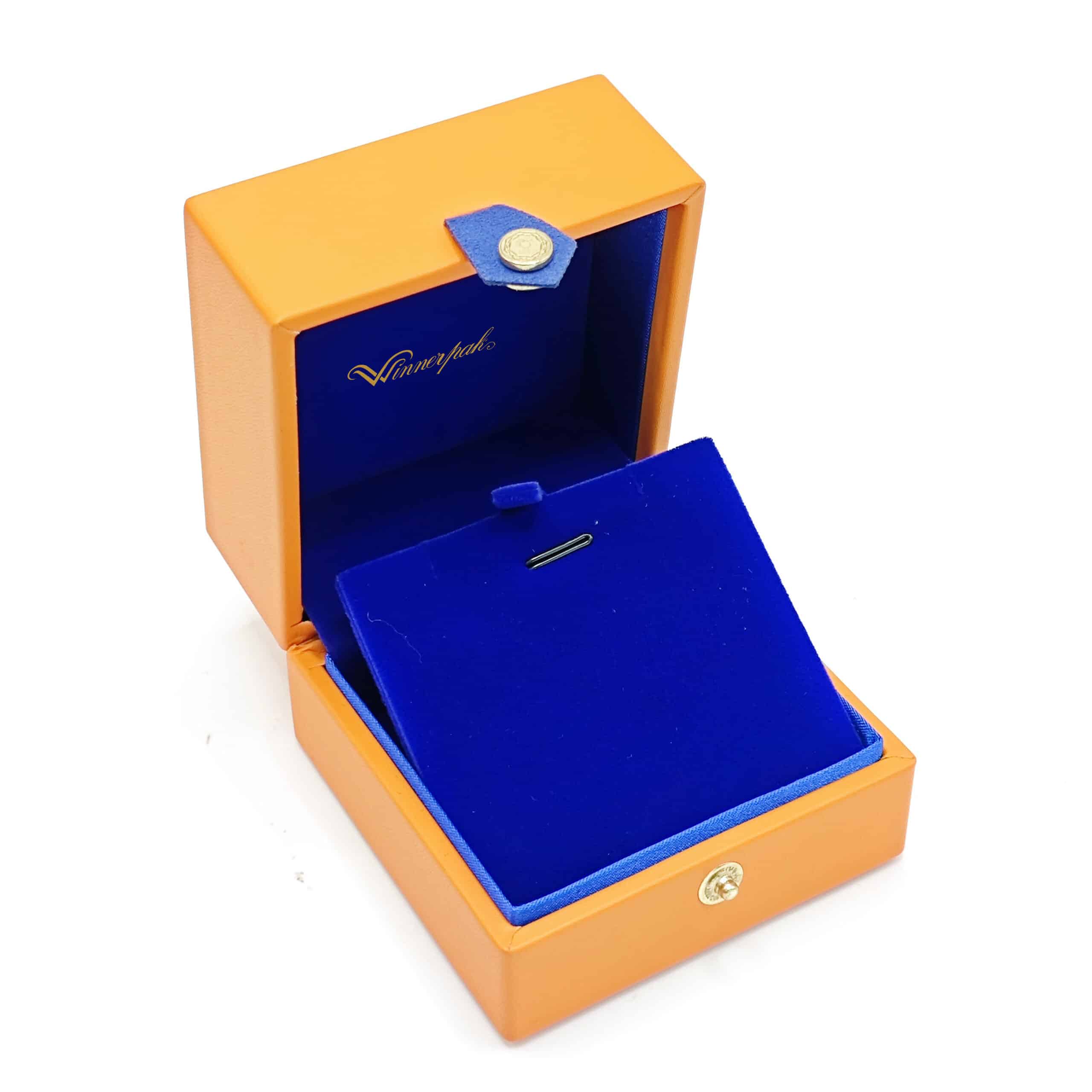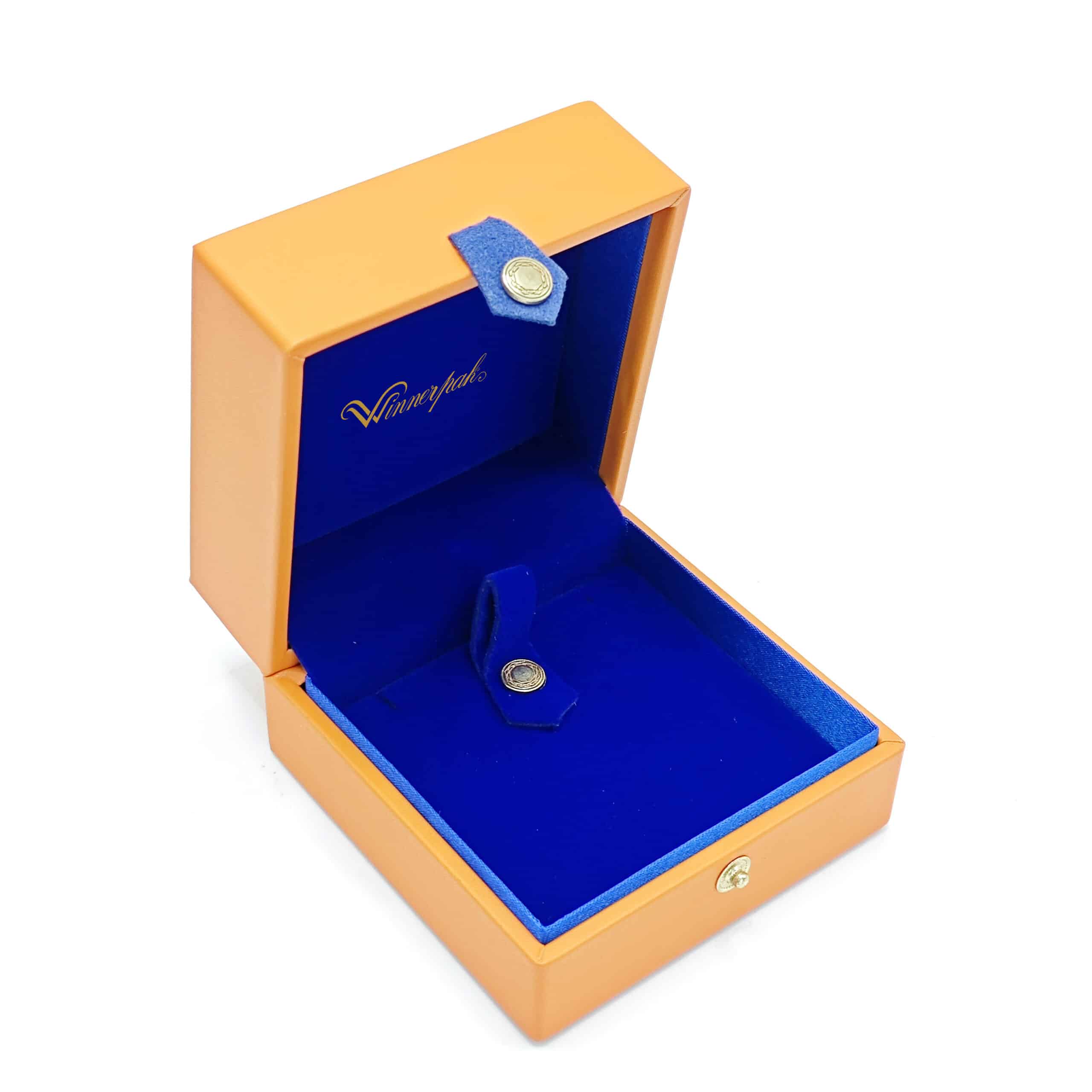 Each box has a square top cushion insert, a button clip opening for security, and a straight-corner profile. Winnerpak’s distinctive “Gentleman’s Clasp,” a navy blue leather tie clasp positioned in the lower center of the lid and resembling the tip of a tie shield, is the focal point of the design. This understated yet endearing element adds a unique contemporary character that blends in flawlessly with high-end jewelry packaging.