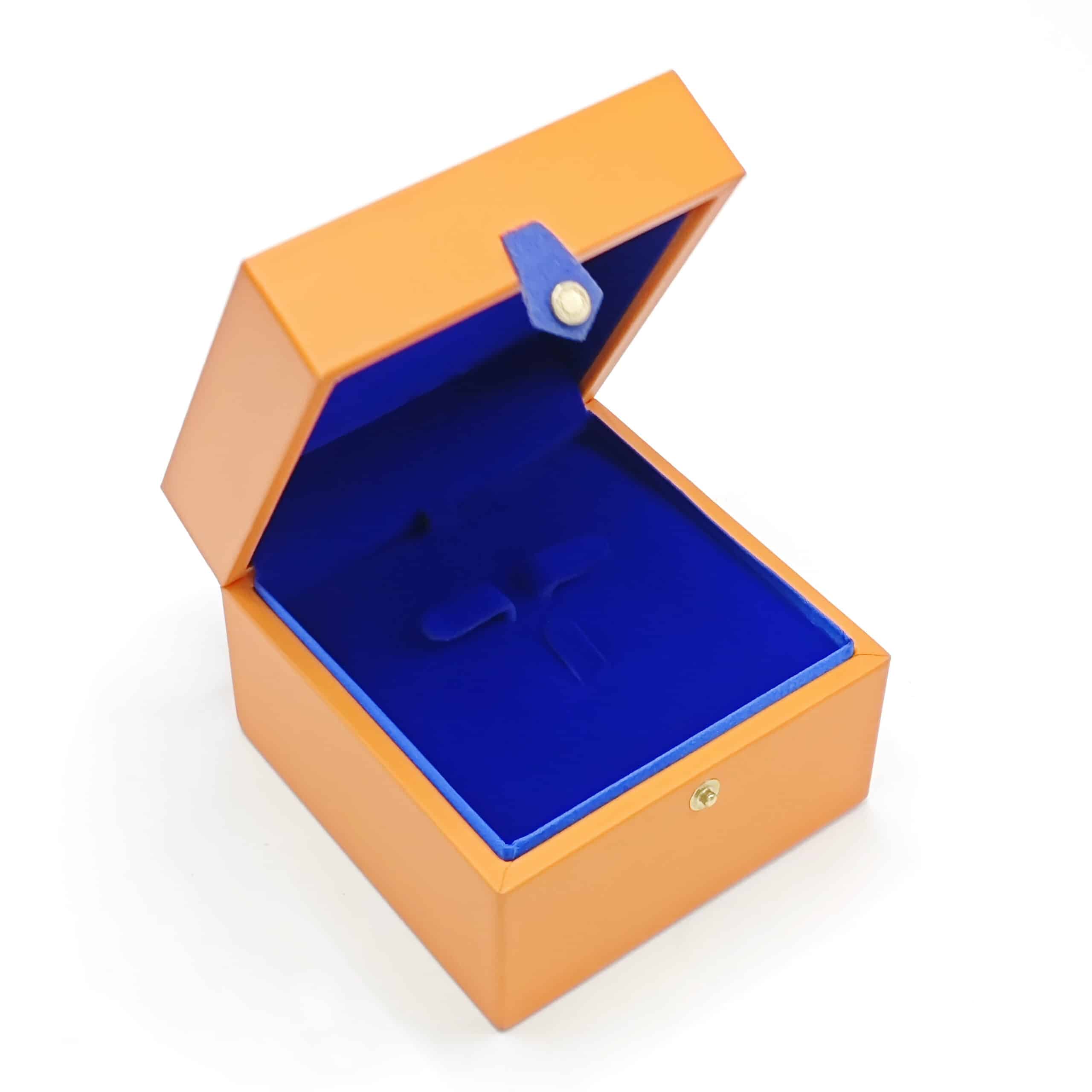 Winnerpak’s SC19B Jewelry Box Series is a sophisticated line of high-end jewelry boxes made for boutiques, brands, and the packaging of fine jewels. These boxes, wrapped in the recognizable Hermès Orange leatherette, exude confidence and luxury elegance. Delicate jewelry pieces are protected and given a sumptuous contrast by the deep navy blue velvet lining within.