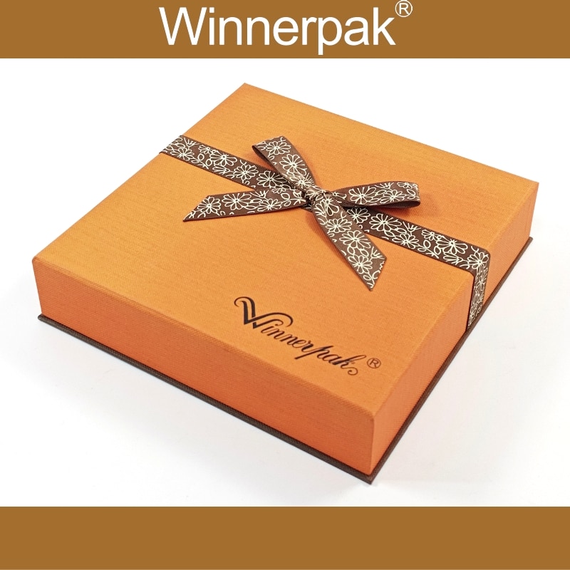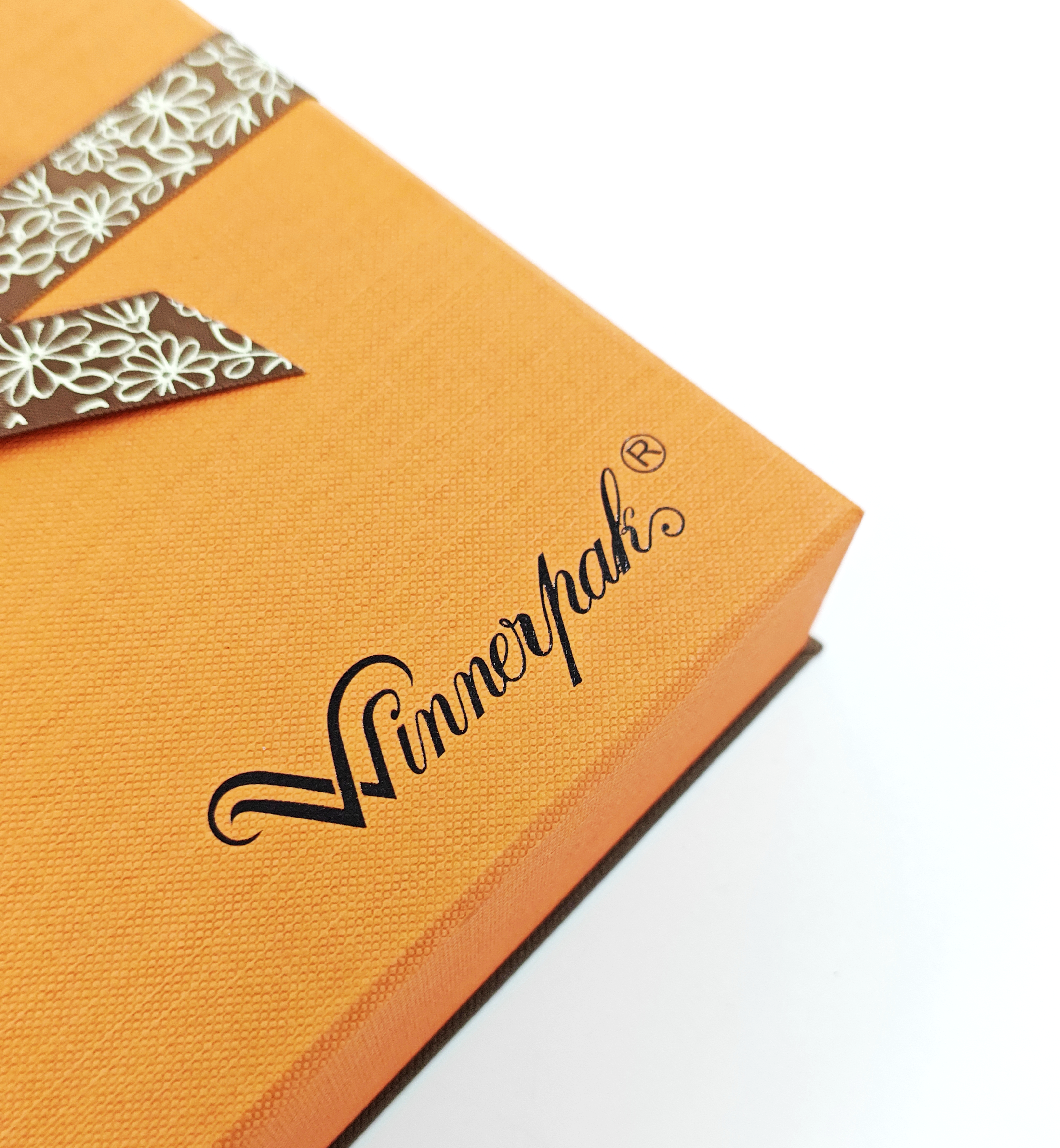 The outside is covered with high-end specialty fancy paper (shown in a brilliant textured orange). This creates a tactile, gripping feel that exudes elegance before the package is even opened.